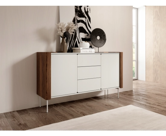 Beżowa komoda Loni to stylowy i praktyczny mebel, który doskonale sprawdzi się w nowoczesnych wnętrzach. Została wyposażona w dwa fronty z dużą ilością półek oraz trzy pojemne szuflady, dzięki czemu oferuje mnóstwo miejsca do przechowywania. Jej szeroki blat idealnie nadaje się do wyeksponowania ozdób, książek lub rodzinnych pamiątek, dodając osobistego charakteru każdemu pomieszczeniu. Wysokiej jakości materiały wykorzystane w produkcji komody gwarantują jej trwałość oraz estetyczny wygląd przez lata. Komoda o szerokości 140 cm została osadzona na eleganckich, metalowych nóżkach, co nie tylko dodaje jej lekkości, ale także ułatwia sprzątanie pod meblem, zapewniając komfort i funkcjonalność.