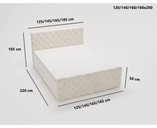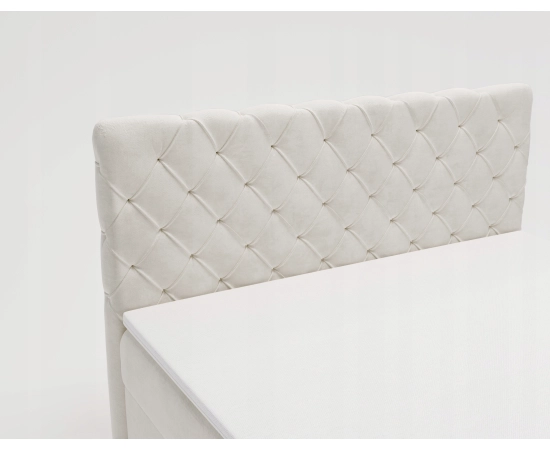 Główny materac opiera się na sprężynach bonellowych o wysokości 20 cm, co gwarantuje stabilne wsparcie i długotrwałą wytrzymałość. Dodatkowy panel przedni nadaje mu futurystyczny wygląd, sprawiając, że łóżko Maris idealnie komponuje się w nowoczesnych aranżacjach sypialni. Ręczne głębokie pikowania..