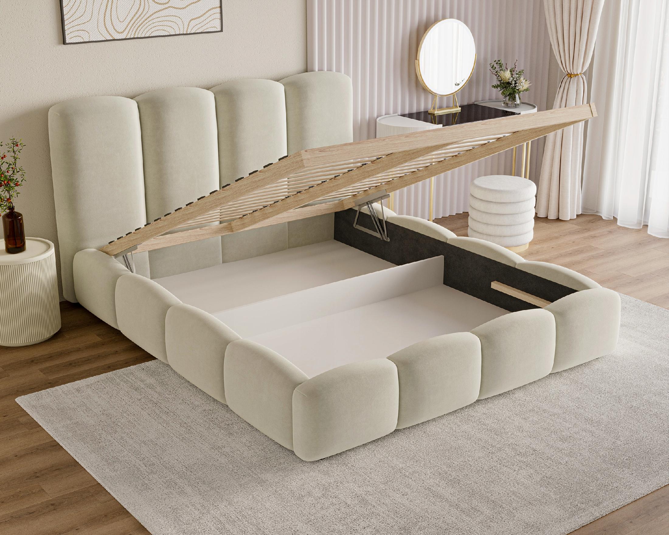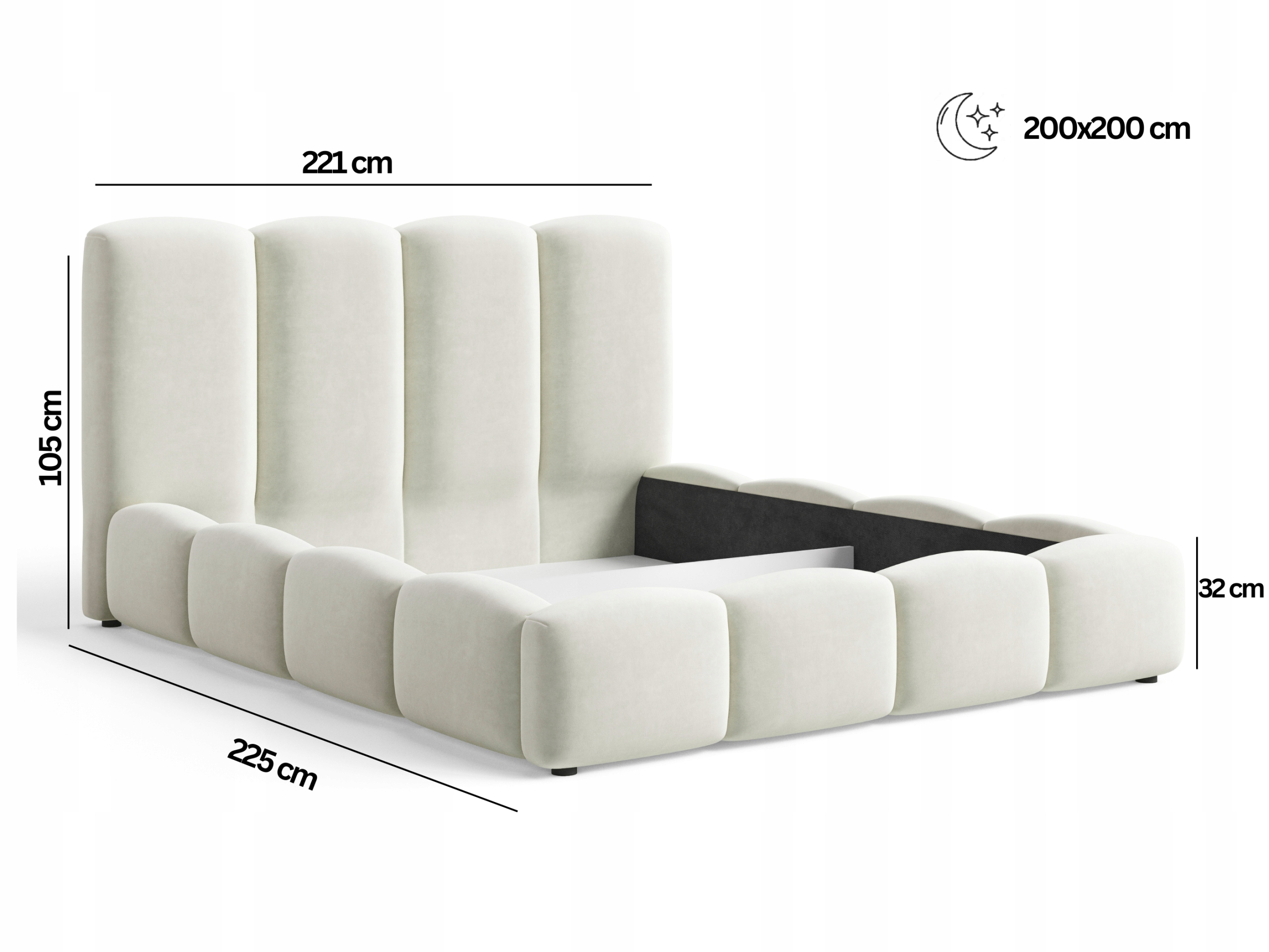 W zestawie znajduje się praktyczny pojemnik na pościel oraz solidny, drewniany stelaż, który gwarantuje odpowiednie podparcie dla materaca. Dla osób poszukujących jeszcze większej wygody, dostępna jest opcja dokupienia metalowego stelaża z podnośnikiem gazowym. Łóżko tapicerowane 200x200 Puffy to idealna propozycja do sypialni urządzonej w stylu minimalistycznym, skandynawskim lub modern soft. Jego nietuzinkowy wygląd sprawia, że może stać się centralnym punktem każdego wnętrza.