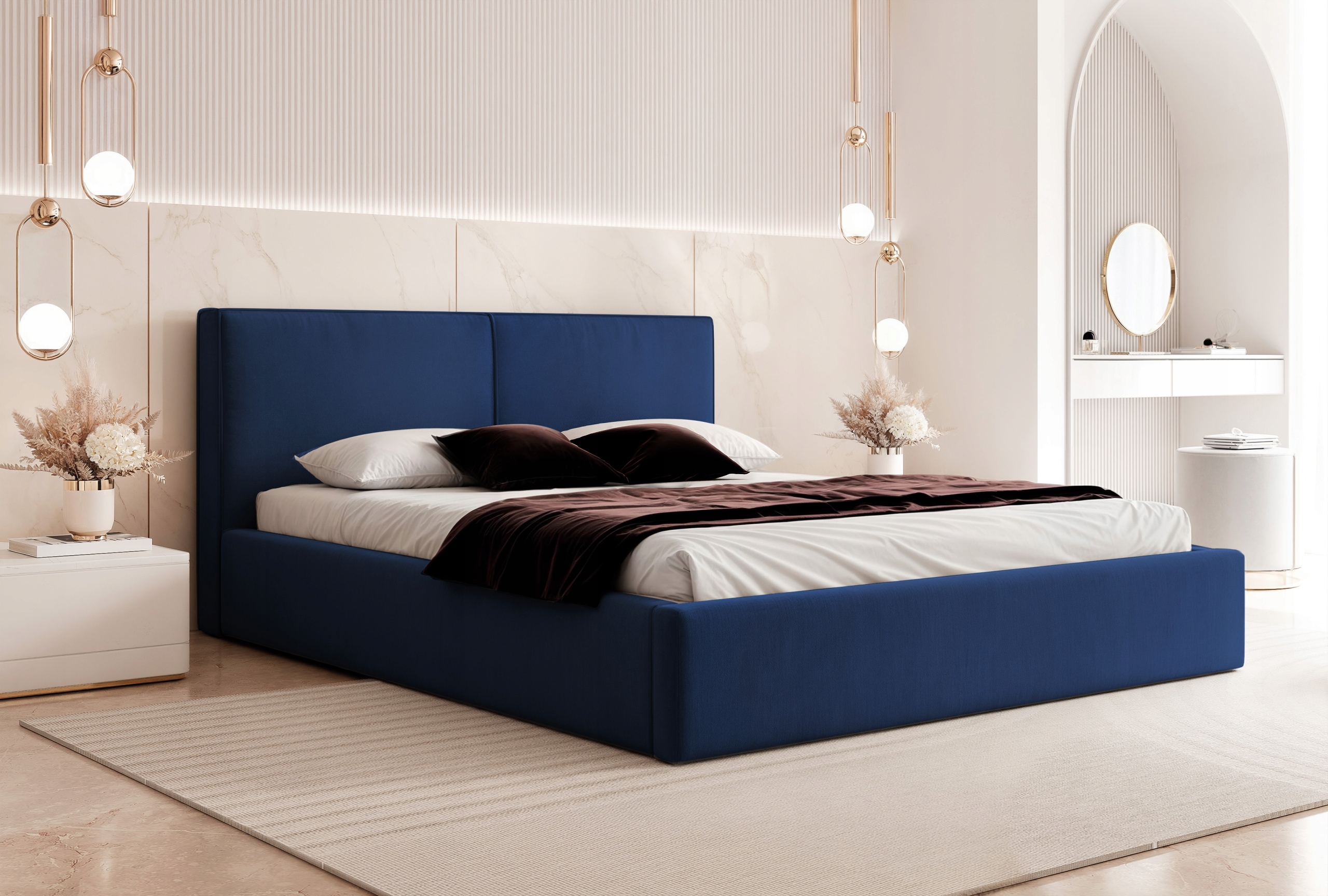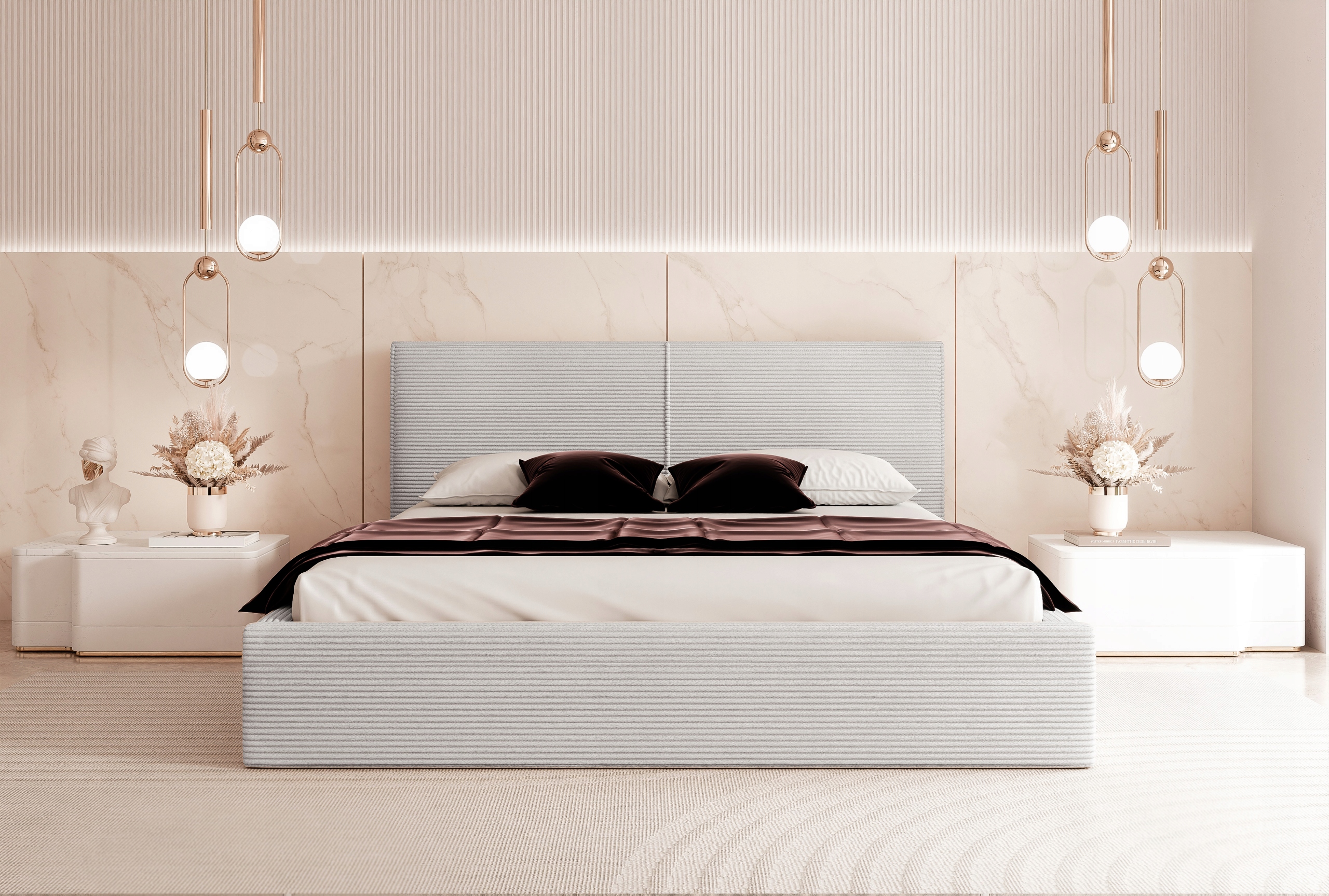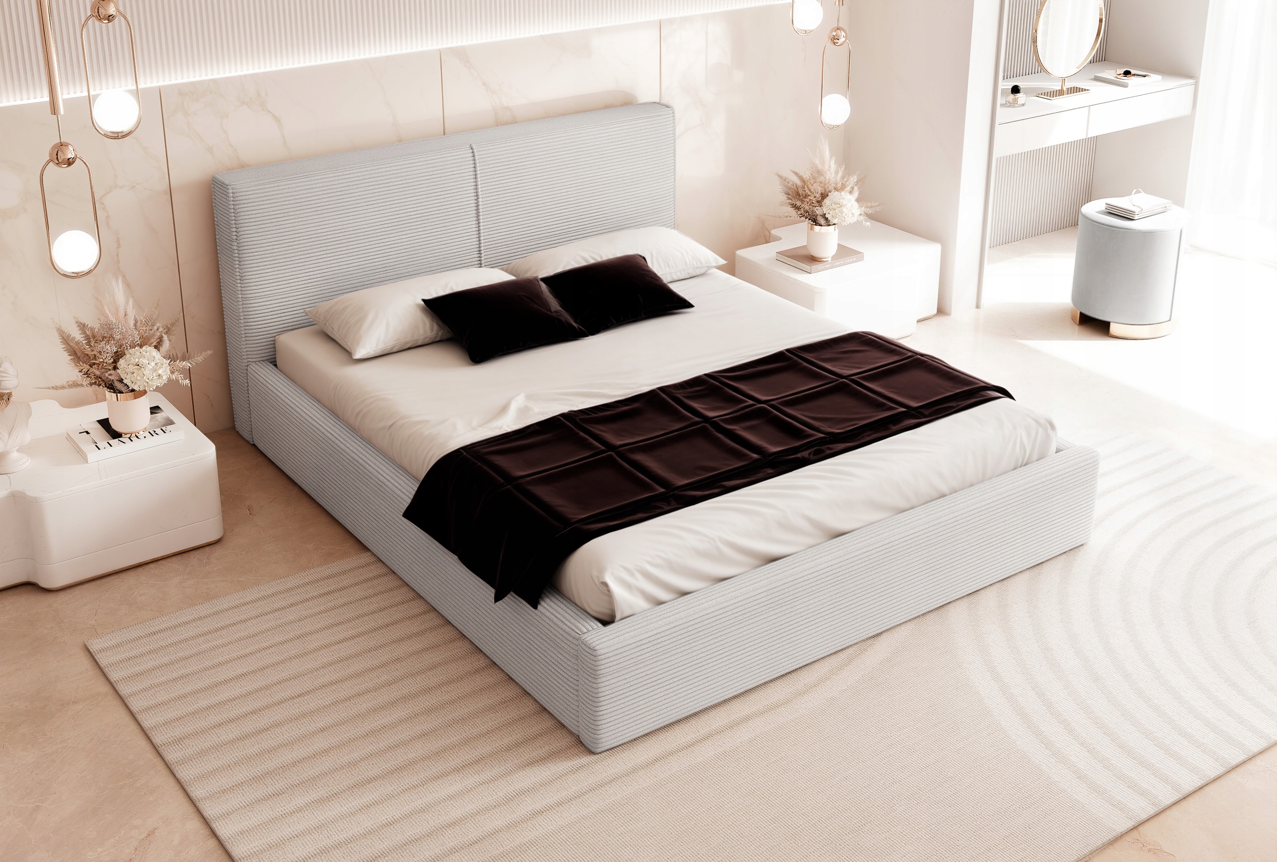 Łóżko Belano 200x200 z pojemnikiem dostępne jest w dwóch wyjątkowych wariantach tkanin – miękkim poso sztruksie oraz eleganckim welurze Dream Velvet. Każdy z materiałów podkreśla jego wyjątkowy wygląd, a szerokie boki i precyzyjne wykończenie nadają całości wrażenia luksusu.