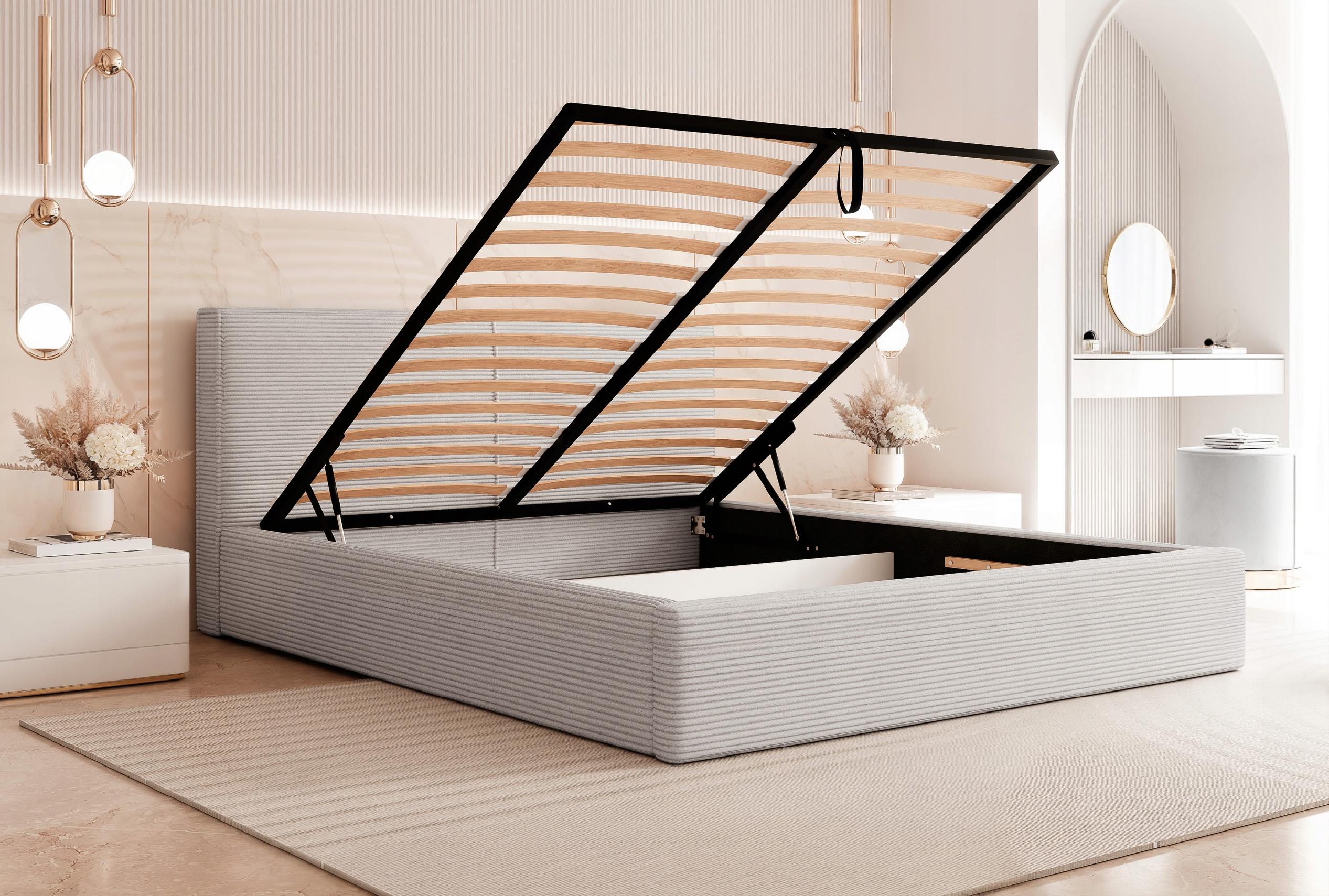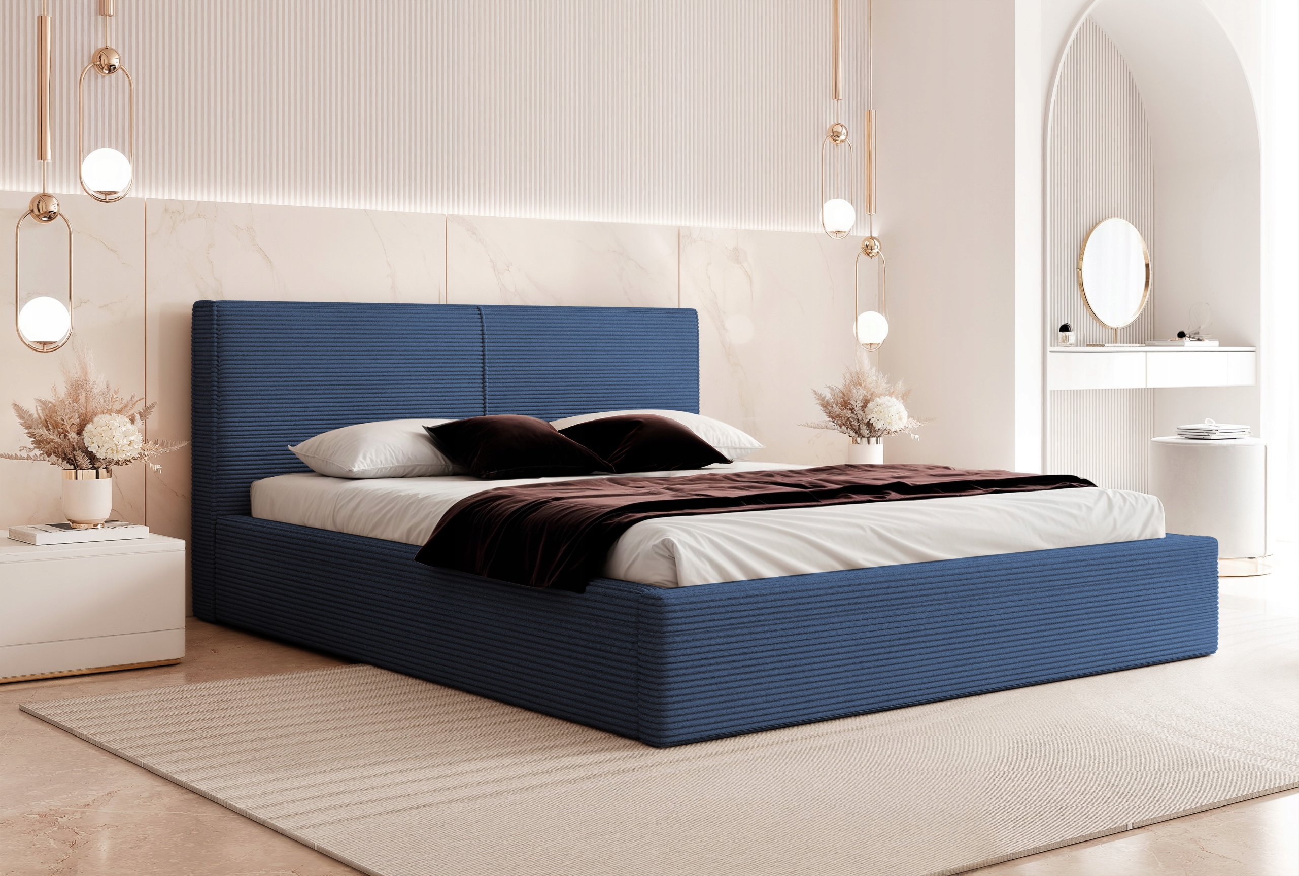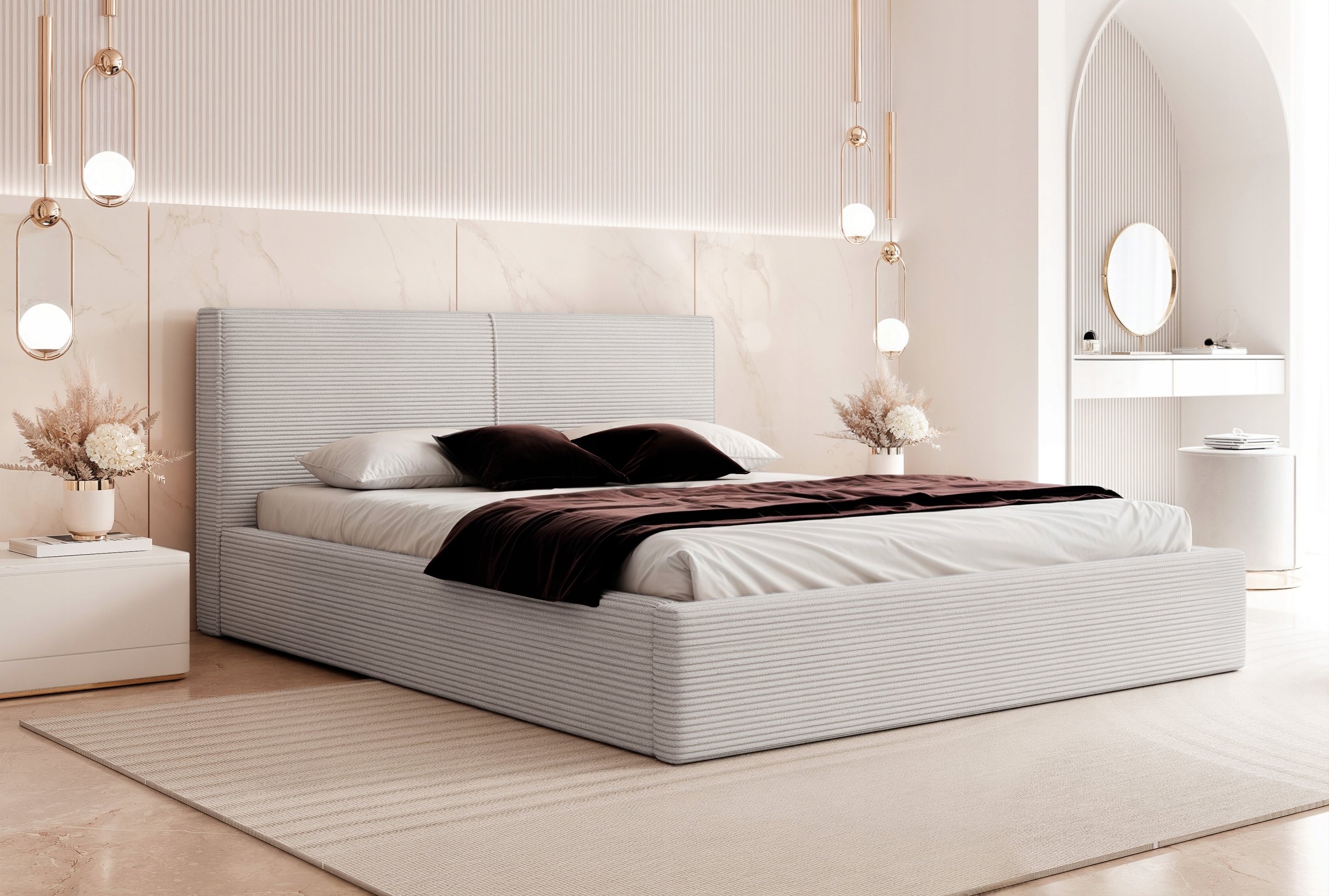 Łóżko Belano 200x200 z pojemnikiem dostępne jest w dwóch wyjątkowych wariantach tkanin – miękkim poso sztruksie oraz eleganckim welurze Dream Velvet. Każdy z materiałów podkreśla jego wyjątkowy wygląd, a szerokie boki i precyzyjne wykończenie nadają całości wrażenia luksusu.