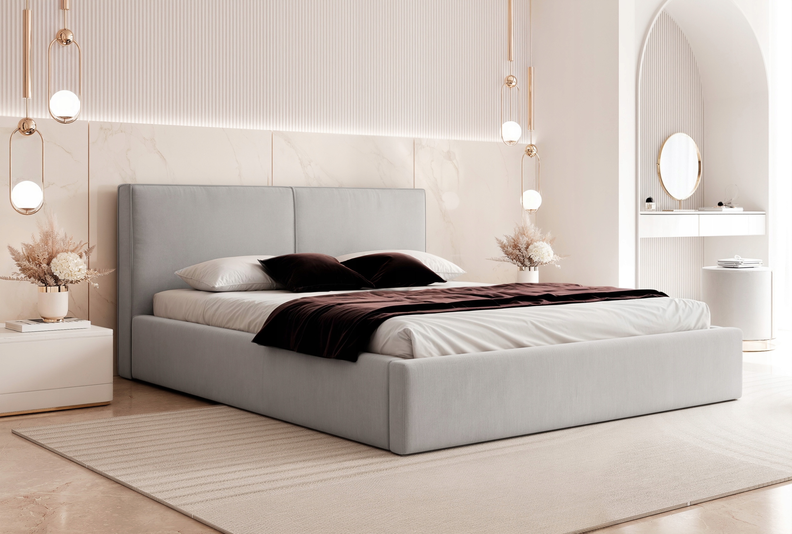 Całe łóżko ma gładką powierzchnię, której subtelnego charakteru dodaje delikatna lamówka umieszczona na bokach wezgłowia. Dzięki temu model prezentuje się elegancko i ponadczasowo, pasując zarówno do nowoczesnych, jak i klasycznych wnętrz.