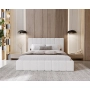 Zastosowanie pojemnika na pościel to dodatkowy atut, który pozwala na efektywne przechowywanie kołder, poduszek czy innych tekstyliów. Drewniany stelaż z automatami sprężynowymi gwarantuje solidne podparcie dla materaca, co wpływa na wygodę i jakość snu. Łóżko osadzone na ślizgach ułatwia jego delikatne przesuwanie i chroni podłogę przed zarysowaniami. Starannie wykonane wciągi i tapicerowane elementy nadają meblowi elegancki, luksusowy wygląd, który sprawia, że stanie się on centralnym punktem każdej sypialni.