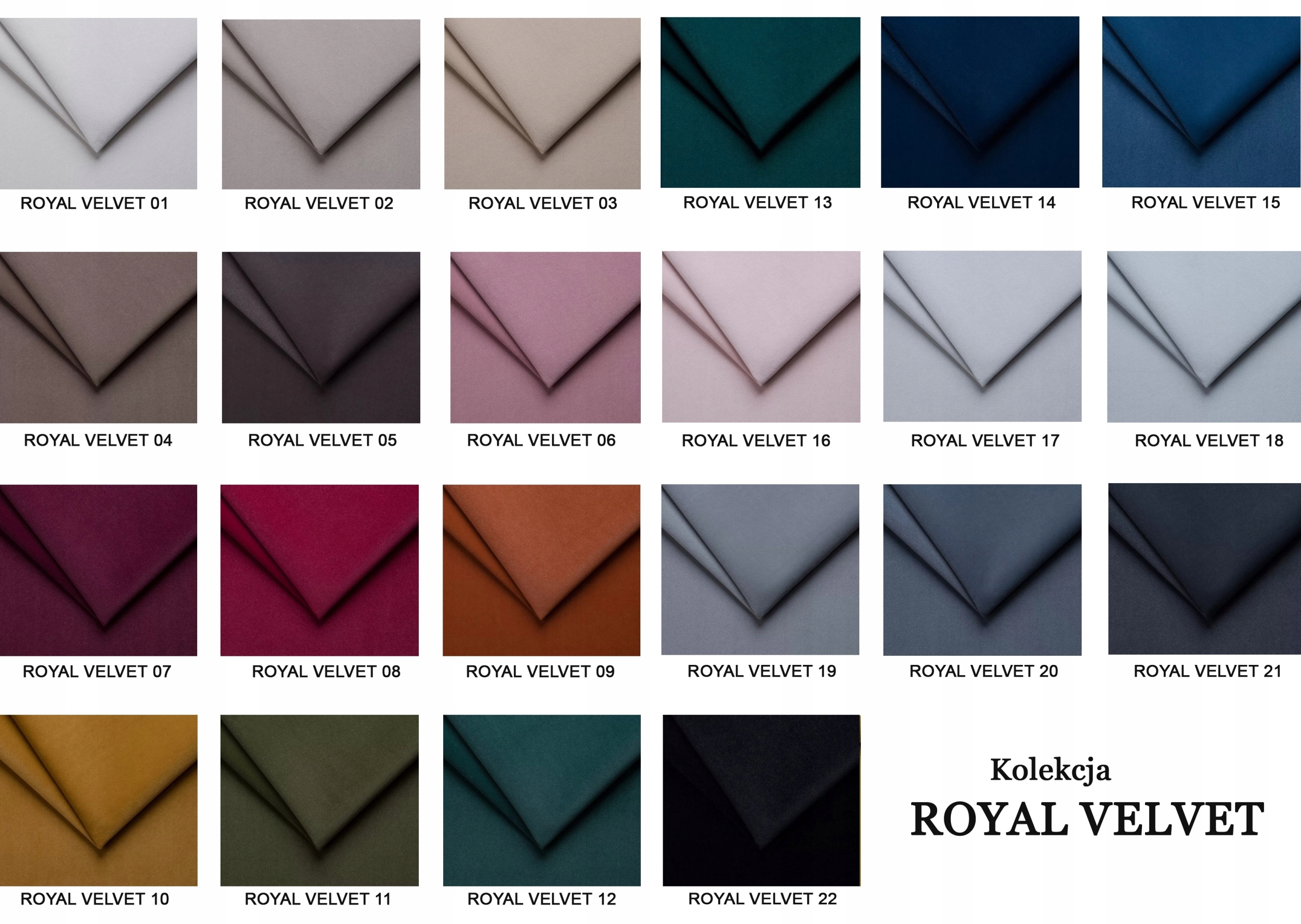 ROYAL VELVET to tkanina welurowa o strukturze pluszu, która zachwyca swoją puszystością, grubością i niezwykłą miękkością w dotyku. Jej elegancka, matowa powierzchnia nie cieniuje i prezentuje się zawsze perfekcyjnie, niezależnie od kąta padania światła. Bogata paleta 22 kolorów – od delikatnych pasteli po intensywne barwy – pozwala na stworzenie mebli obiciowych dopasowanych do każdego stylu wnętrza.
