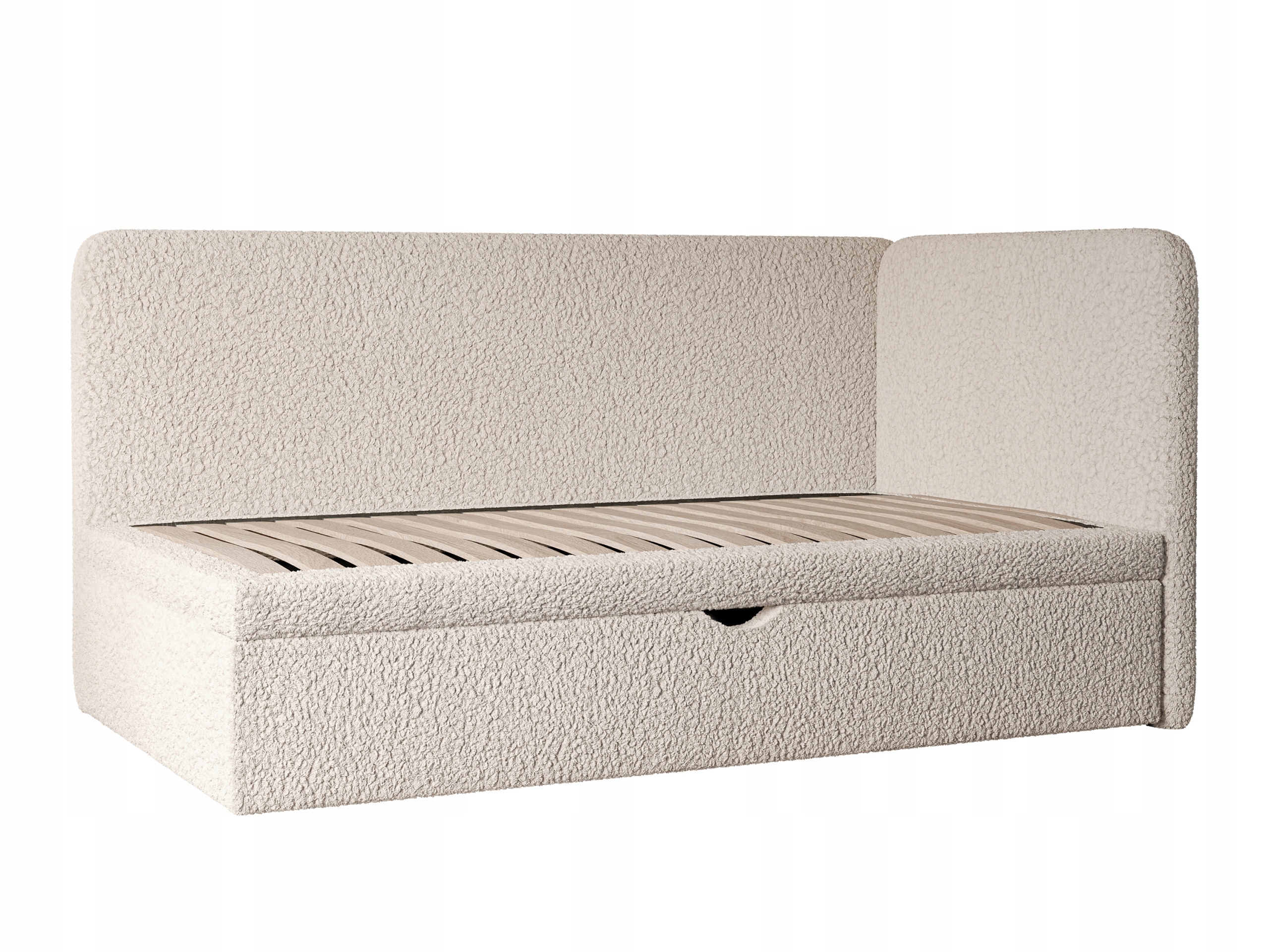 Model posiada praktyczny wysuwany pojemnik na pościel, który pomieści kołdry, poduszki i inne akcesoria, ułatwiając utrzymanie porządku w pokoju. Tapicerka z modnej tkaniny baranek nadaje łóżku wyjątkowego charakteru, sprawiając, że wnętrze staje się przytulne i stylowe.