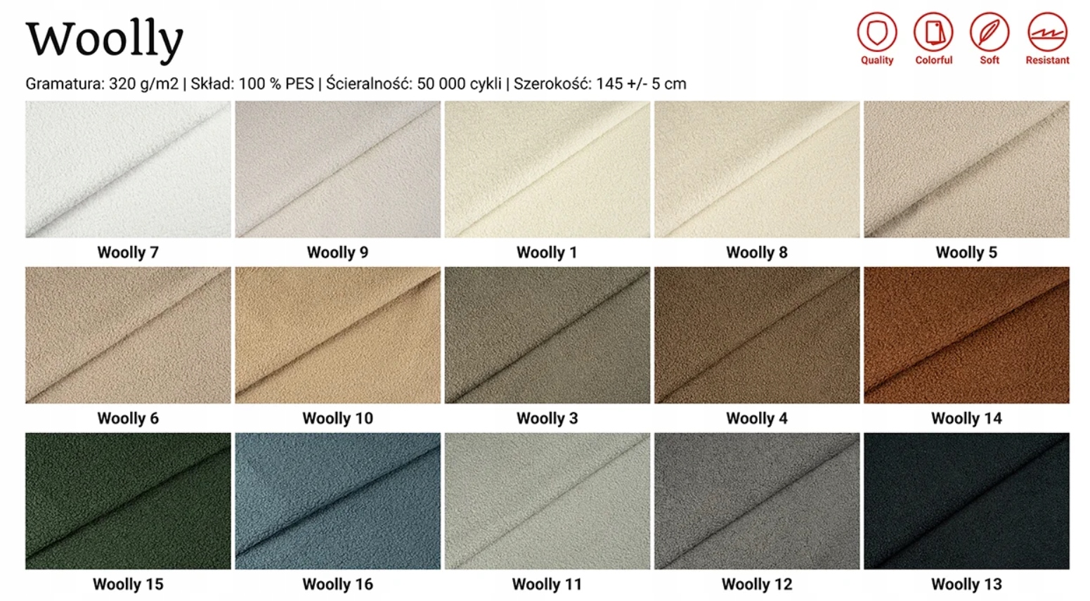 WOOLLY - prawdziwy klejnot wśród materiałów tapicerskich! Ta wyjątkowa tkanina zachwyca swoją fakturą, która do złudzenia przypomina naturalną wełnę, oferując jednocześnie niezrównaną trwałość i łatwość pielęgnacji.