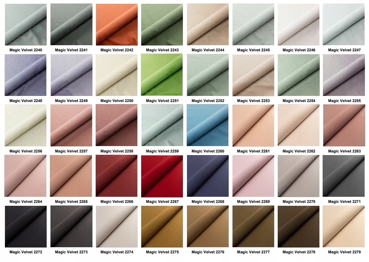 MAGIC VELVET to niezwykle puszysta oraz miękka w dotyku tkanina obiciowa na meble, poduszki i zasłony. Łatwa w utrzymaniu czystości. Pluszowy welwet jest jednocześnie wytrzymały na zadrapania i odporny na zwierzęta. Delikatnie odbija światło dając charakterystyczny i subtelny połysk.