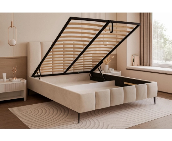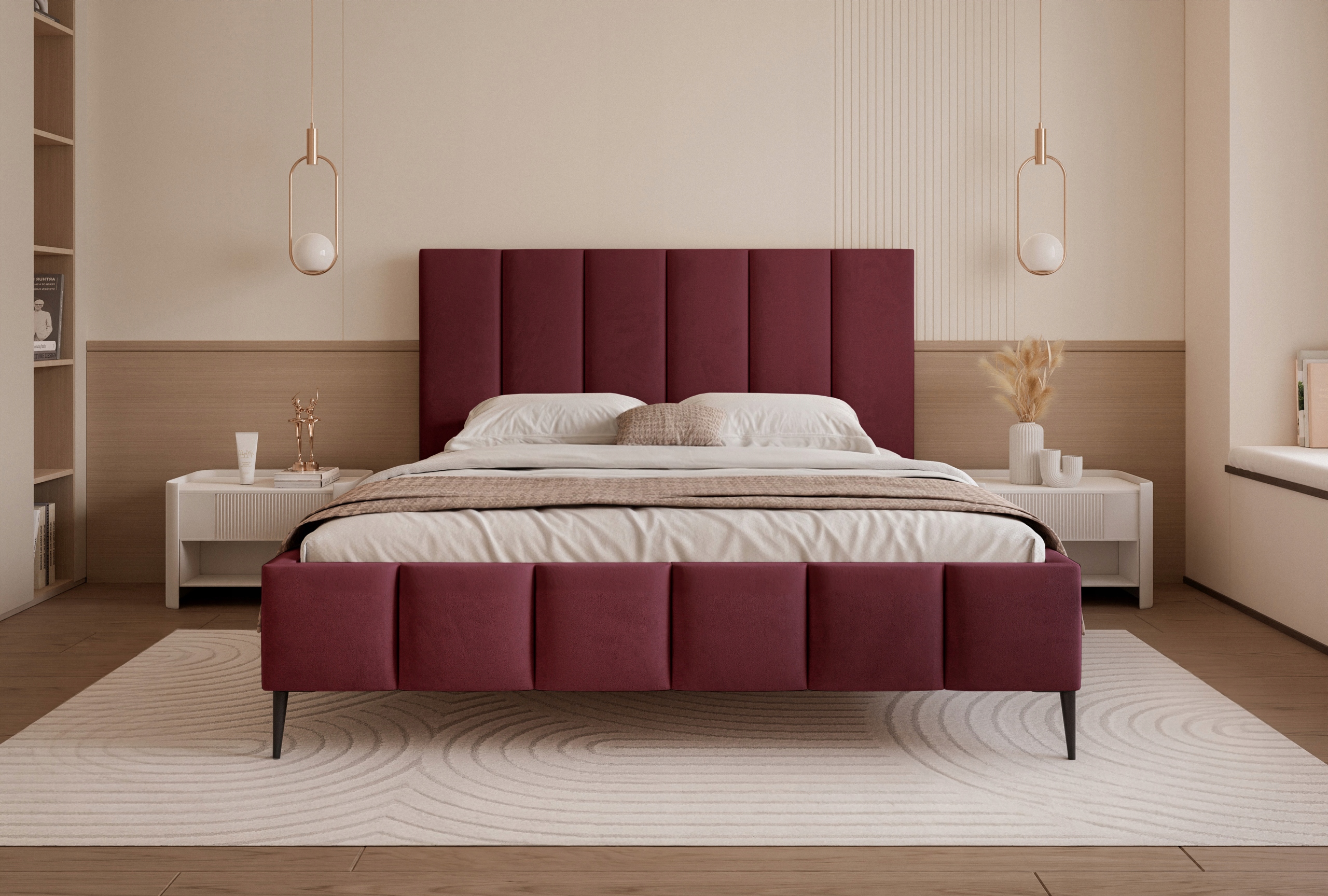 Łóżko sypialniane Tamara 200x200 to nowoczesne i funkcjonalne rozwiązanie do sypialni. Posiada pojemnik na pościel, który zapewnia dodatkowe miejsce do przechowywania. Osadzone jest na wysokich czarnych nogach, co dodaje mu elegancji i lekkości. Zarówno zagłówek, jak i panel przedni łóżka zdobią pionowe pasy wykonane z grubej pianki, zapewniając stylowy wygląd i wygodę. Konstrukcja łóżka opiera się na cienkim szkielecie typu slim, co czyni je lekkim, ale solidnym. Wyposażone w drewniany stelaż, zapewnia odpowiednie podparcie dla materaca. Dostępne w popularnej, trwałej tkaninie, idealnie pasuje do różnych wnętrz.