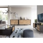 Front składa się z 2-drzwiowych drzwiczek, które posiadają system push to open a po otwarciu znajdziemy cztery funkcjonalne półki. Alternatywą do tej opcji jest ta sama komoda natomiast z szufladami. Znajdziesz ją również w naszej ofercie. Cały front wypełniony jest kolorem dąb evoke który posiada frezowany czarny wzór przypominający jodełkę.