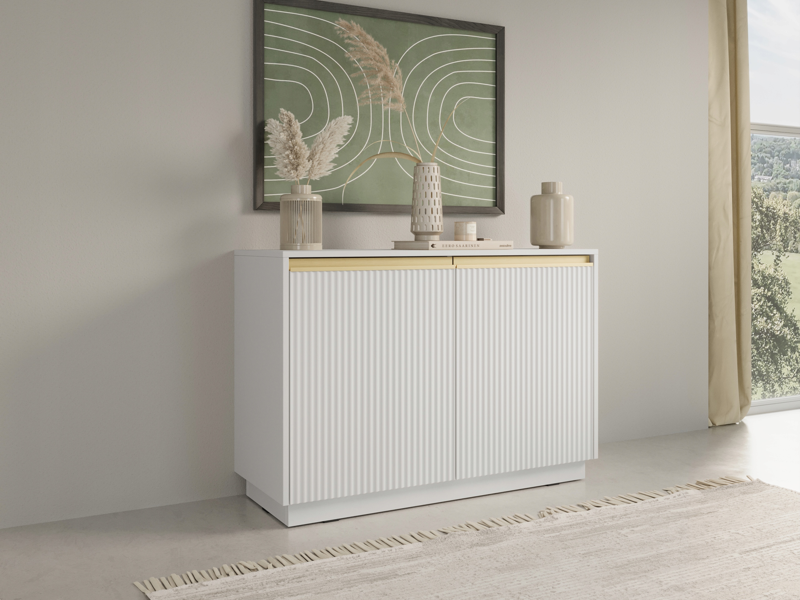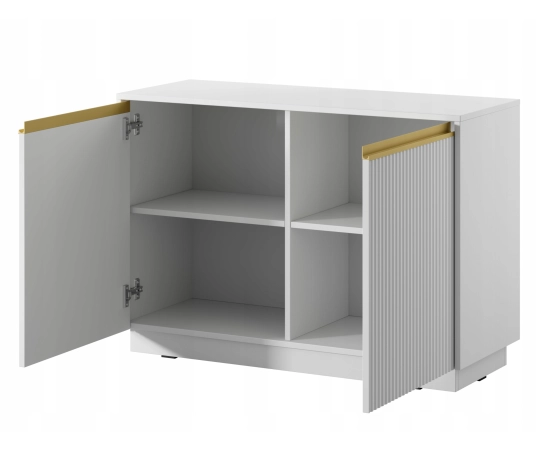 Elegancka i nowoczesna komoda do salonu o subtelnym, minimalistycznym wyglądzie. Wykonana z wysokiej jakości materiałów, posiada fronty z delikatnymi pionowymi żłobieniami, które nadają jej wyjątkowy charakter. Złote uchwyty subtelnie kontrastują z jasną barwą komody, dodając jej luksusowego wyrazu. Wnętrze wyposażone jest w cztery przestrzenie na przechowywanie, co zapewnia dużo miejsca na różnorodne przedmioty, a dodatkowe półki zwiększają funkcjonalność mebla. Dzięki zamykanym drzwiczkom można łatwo zachować porządek i estetykę. Idealna do salonu, sypialni lub biura – wszędzie tam, gdzie liczy się styl i praktyczność.