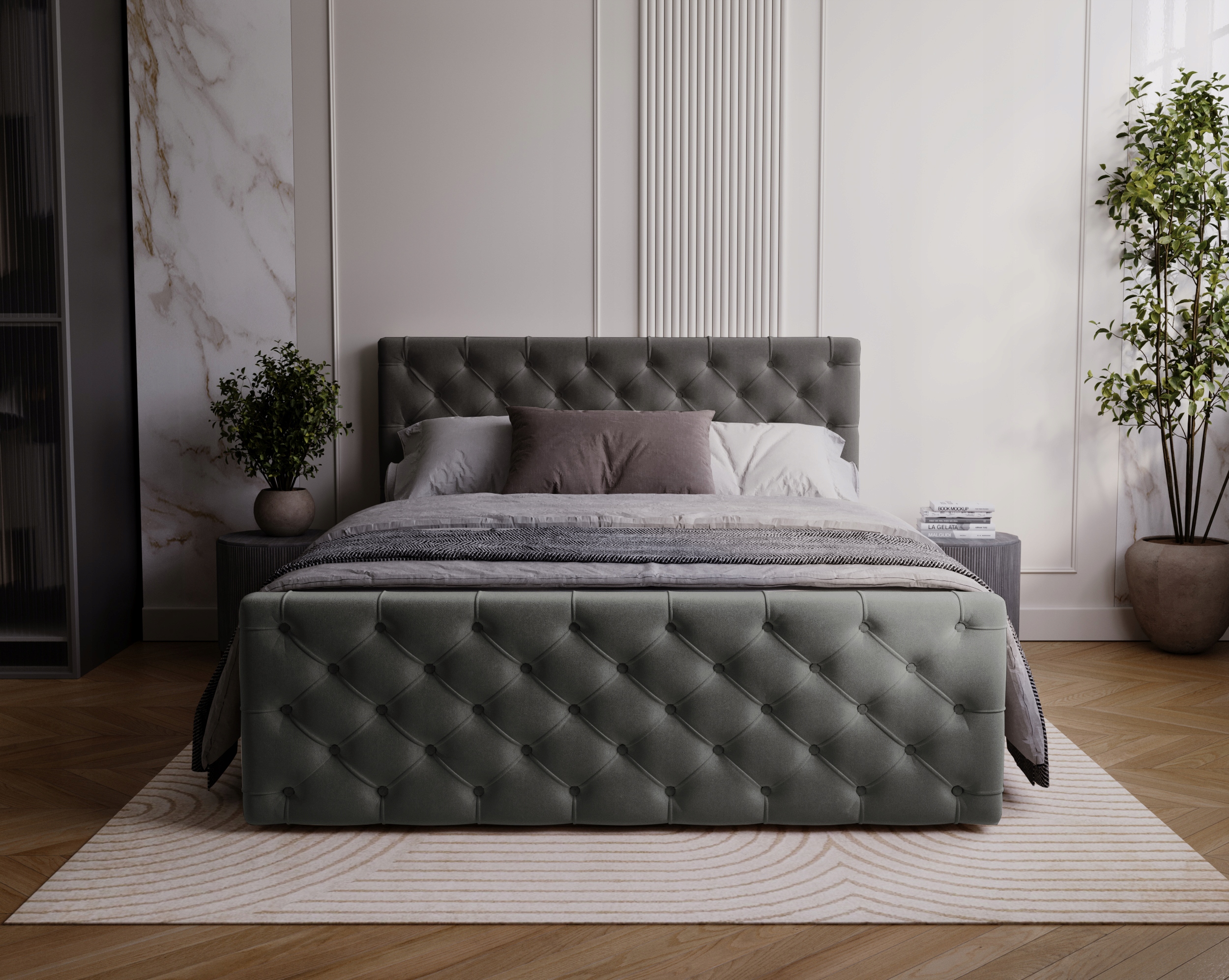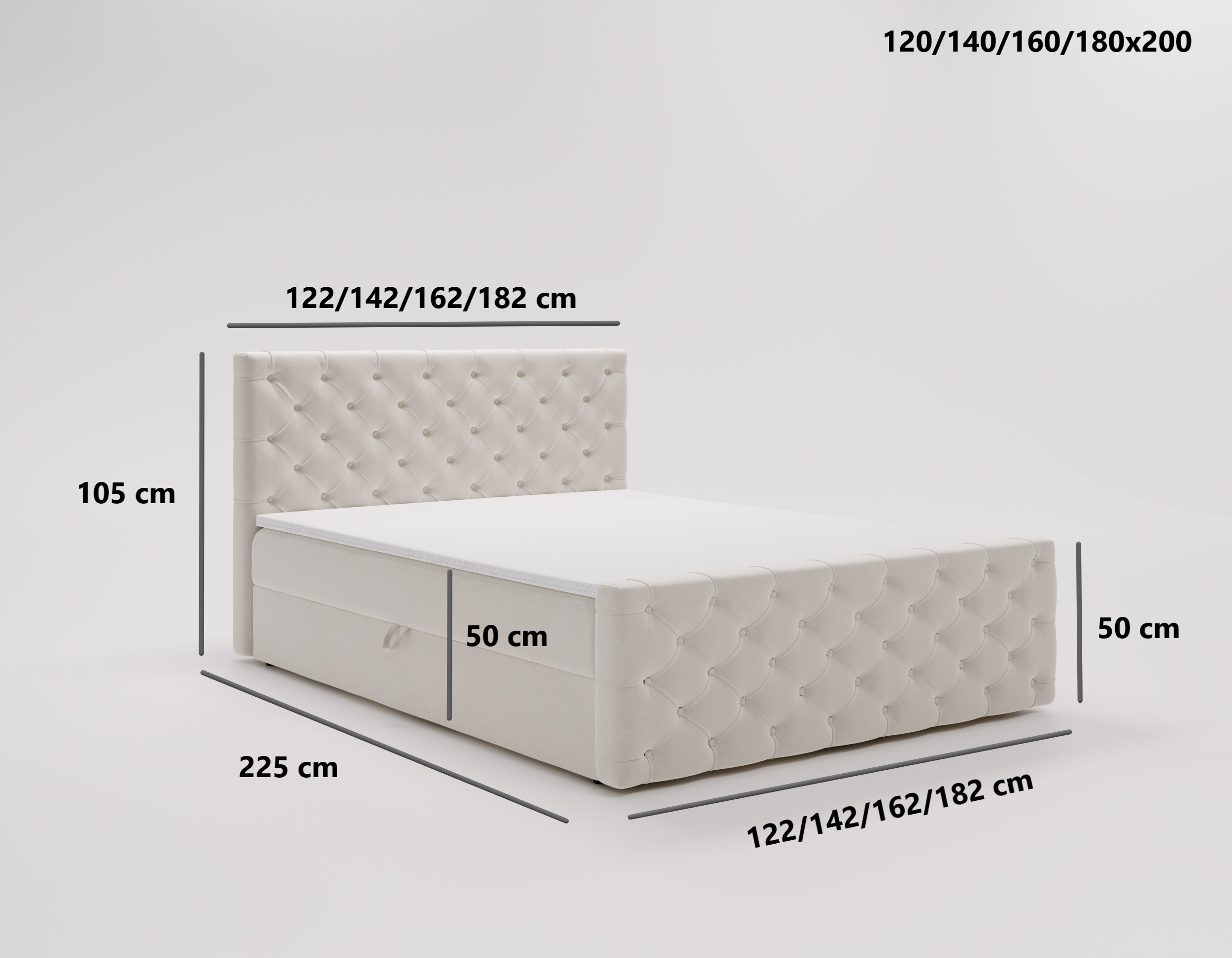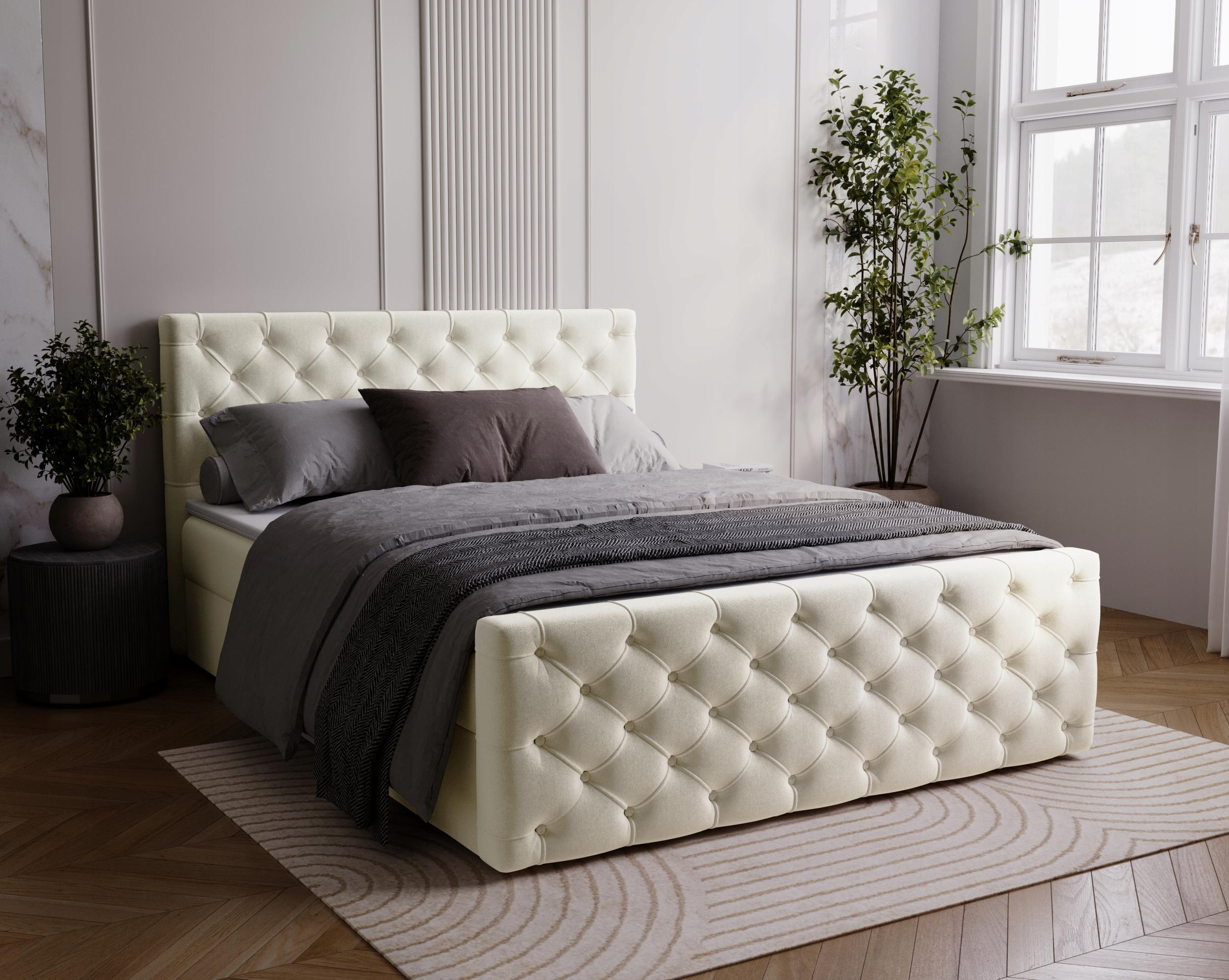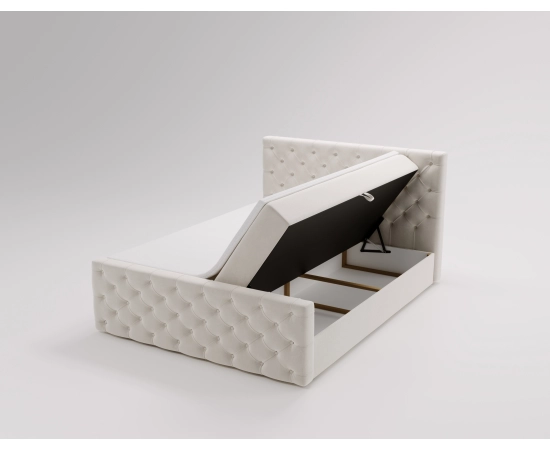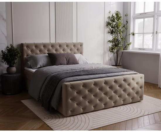 Główny materac opiera się na sprężynach bonellowych o wysokości 20 cm, co gwarantuje stabilne wsparcie i długotrwałą wytrzymałość. Dodatkowy panel przedni nadaje mu futurystyczny wygląd, sprawiając, że łóżko Maris idealnie komponuje się w nowoczesnych aranżacjach sypialni. Ręczne pikowania wykończone materiałowymi guzikami.