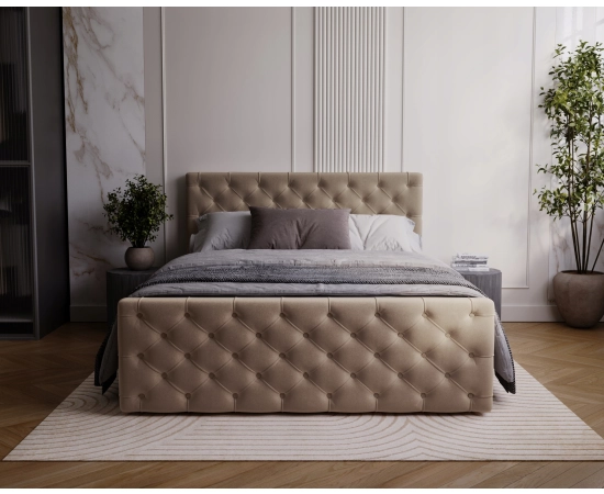 Eleganckie łóżko kontynentalne 160x200 Maris to połączenie komfortu, funkcjonalności i klasycznego stylu Chesterfield, które doskonale sprawdzi się w każdym wnętrzu. Wykonane z wysokiej jakości materiałów, gwarantuje nie tylko wygodny sen, ale również wprowadza wyjątkowy charakter do sypialni. Model ten oferuje dwa pojemniki na pościel, co zapewnia praktyczne rozwiązanie do przechowywania. W zestawie znajduje się topper o grubości 4 cm, który poprawia komfort użytkowania i podwyższa ergonomię łóżka.