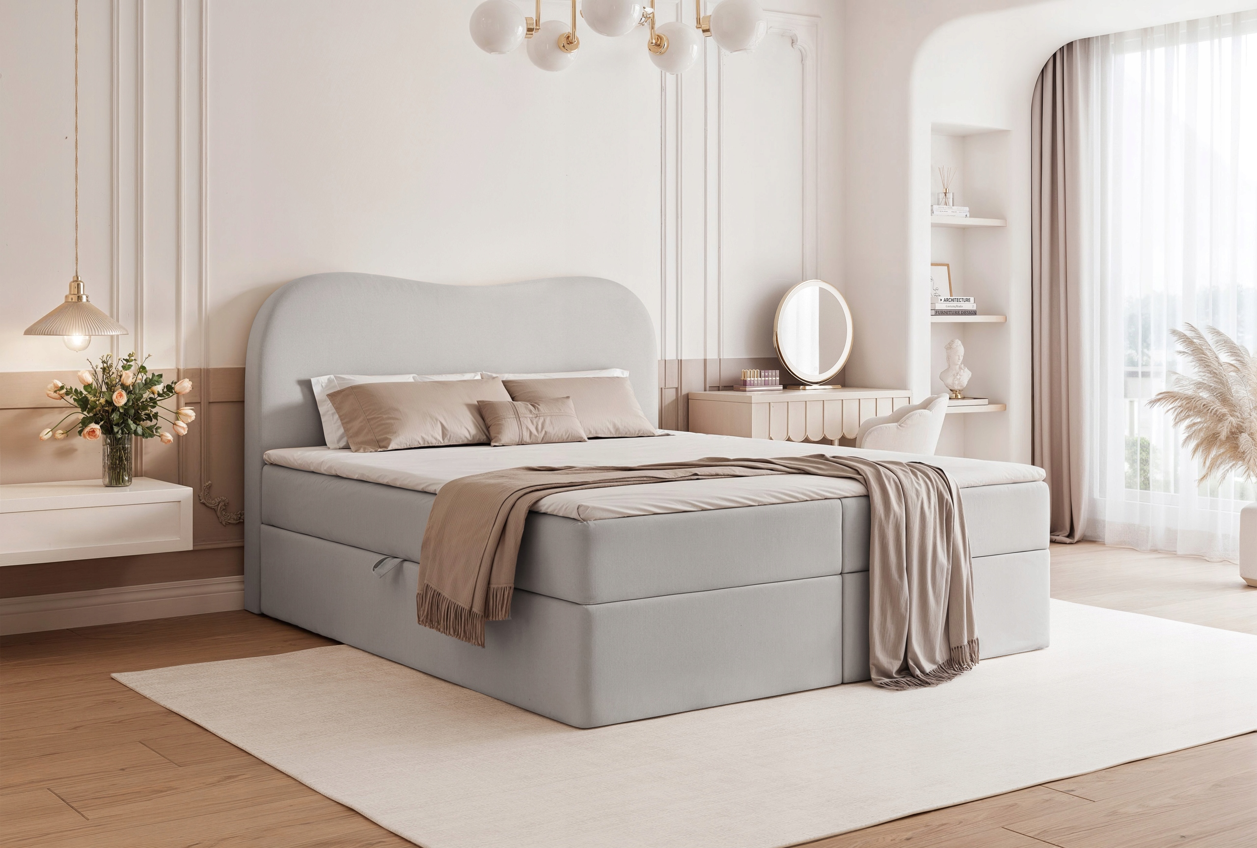 Łóżko kontynentalne Sven 200x200 cm to propozycja dla osób ceniących nowoczesny design i maksymalny komfort snu. Charakterystyczny zaokrąglony zagłówek nadaje mu wyjątkowo przytulny wygląd, a jednocześnie podkreśla elegancki charakter mebla.