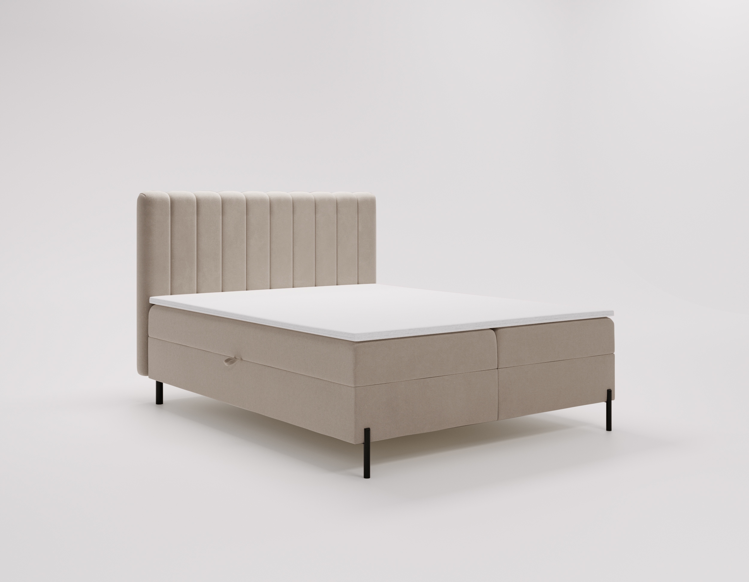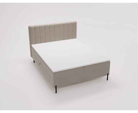 Główny materac opiera się na sprężynach bonellowych o wysokości 20 cm, co gwarantuje stabilne wsparcie i długotrwałą wytrzymałość. Zagłowie łóżka posiada pionowe wszycia, które nadają mu stylowy i minimalistyczny wygląd.