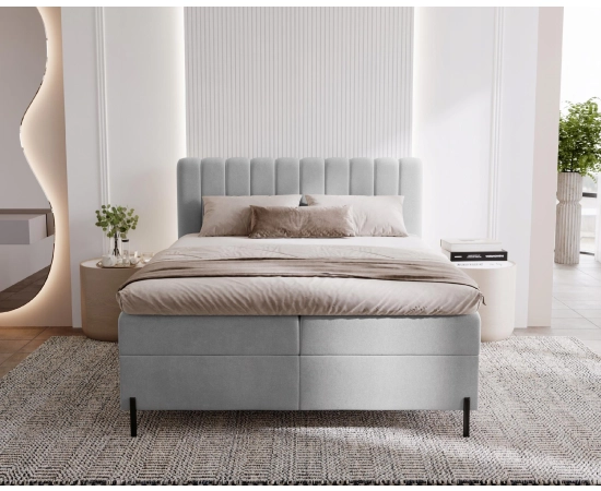 Główny materac opiera się na sprężynach bonellowych o wysokości 20 cm, co gwarantuje stabilne wsparcie i długotrwałą wytrzymałość. Zagłowie łóżka posiada pionowe wszycia, które nadają mu stylowy i minimalistyczny wygląd.