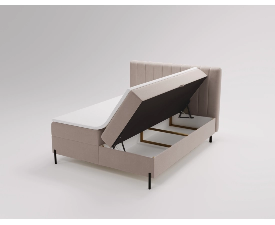 Główny materac opiera się na sprężynach bonellowych o wysokości 20 cm, co gwarantuje stabilne wsparcie i długotrwałą wytrzymałość. Zagłowie łóżka posiada pionowe wszycia, które nadają mu stylowy i minimalistyczny wygląd.