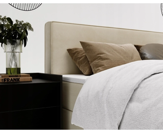 Główny materac opiera się na sprężynach bonellowych o wysokości 20 cm, co gwarantuje stabilne wsparcie i długotrwałą wytrzymałość. Zagłowię łóżka posiada elegancką lamówkę na obrzeżach, które nadają stylowy i minimalistyczny wygląd.