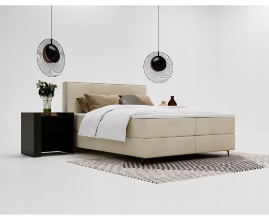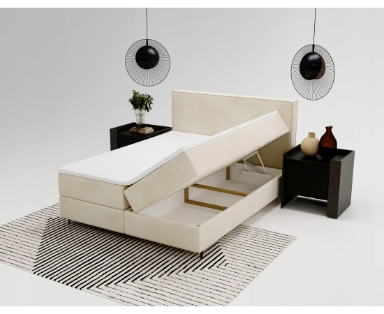 Łóżko kontynentalne 160x200 Gloria Box wyróżnia się eleganckim, nowoczesnym designem z dodatkowymi elementami, które podkreślają jego funkcjonalność i estetykę. Charakteru dodają nóżki o wysokości 10cm. Model ten oferuje dwa duże pojemniki na pościel, co zapewnia praktyczne rozwiązanie do przechowywania. W zestawie znajduje się topper o grubości 4 cm, który poprawia komfort użytkowania i podwyższa ergonomię łóżka.