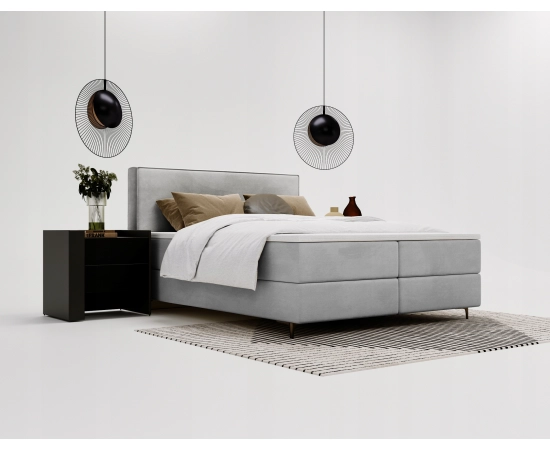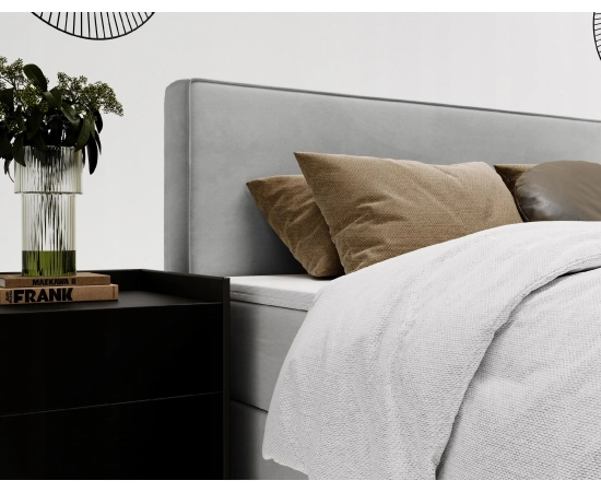 Główny materac opiera się na sprężynach bonellowych o wysokości 20 cm, co gwarantuje stabilne wsparcie i długotrwałą wytrzymałość. Zagłowię łóżka posiada elegancką lamówkę na obrzeżach, które nadają stylowy i minimalistyczny wygląd.