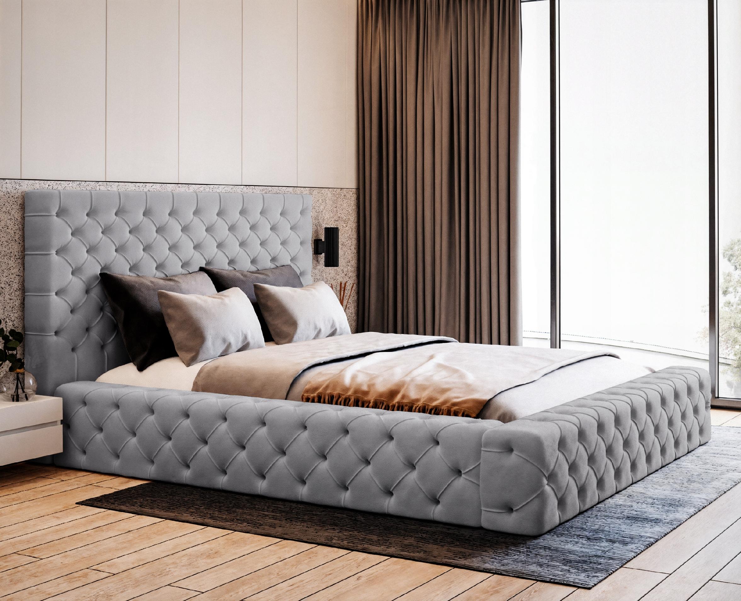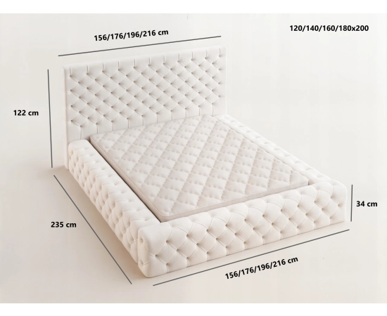 Łóżko do sypialni Rossano 180x200 jest modelem z kolekcji premium wykonanym w pięknym pikowanym stylu glamour. Oryginalne grube boczki, gęste pikowanie materiałowymi guzikami oraz każda zakładka robiona ręcznie tworzą unikatową całość. Łóżko sypialniane czerpie ze stylu chesterfield wszystko co najpiękniejsze do twojej sypialni. Łóżko tapicerowane 180x200 Rossano prezentuje się niezwykle królewsko. Imponującym elementem tego modelu jest jego wysokie zagłowie osiągające wysokość 122cm. Jednym z najważniejszych atutów tego łóżka jest duży pojemnik na pościel, umieszczony wewnątrz ramy. W zestawie znajduję się stelaż drewniany podnoszony do góry na podnośnikach sprężynowych.