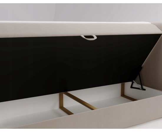 Dwa pojemne schowki z automatycznym otwieraniem sprężynowym sprawiają, że organizacja pościeli i koców jeszcze nigdy nie była tak prosta. Komfort snu zapewnia dodatkowy topper, który idealnie dopasowuje się do ciała, zapewniając relaks na najwyższym poziomie – zawsze świeży i łatwy do utrzymania w czystości.