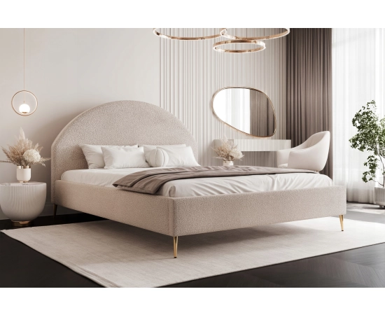 Łóżko sypialniane Velora 200x200 to nowoczesna propozycja, która wyróżnia się eleganckim designem i funkcjonalnością. Posiada pojemny schowek na pościel, idealny do przechowywania dodatkowej kołdry czy poduszek. Stylowe, półokrągłe wezgłowie w połączeniu z wąskimi bokami nadaje całości lekkiego i nowoczesnego charakteru. Mebel został osadzony na praktycznych wysokich nogach, co ułatwia dostęp pod łóżko (3 kolory nóg do wyboru). Tapicerka z tkaniny boucle oraz miękkiego veluru nie tylko pięknie się prezentuje, ale także zapewnia wyjątkowy komfort użytkowania. W zestawie znajduje się solidny stelaż drewniany, który zapewnia odpowiednie podparcie dla materaca. Tapicerowane łóżko Velora to doskonały wybór dla osób ceniących nowoczesny styl i wygodę.