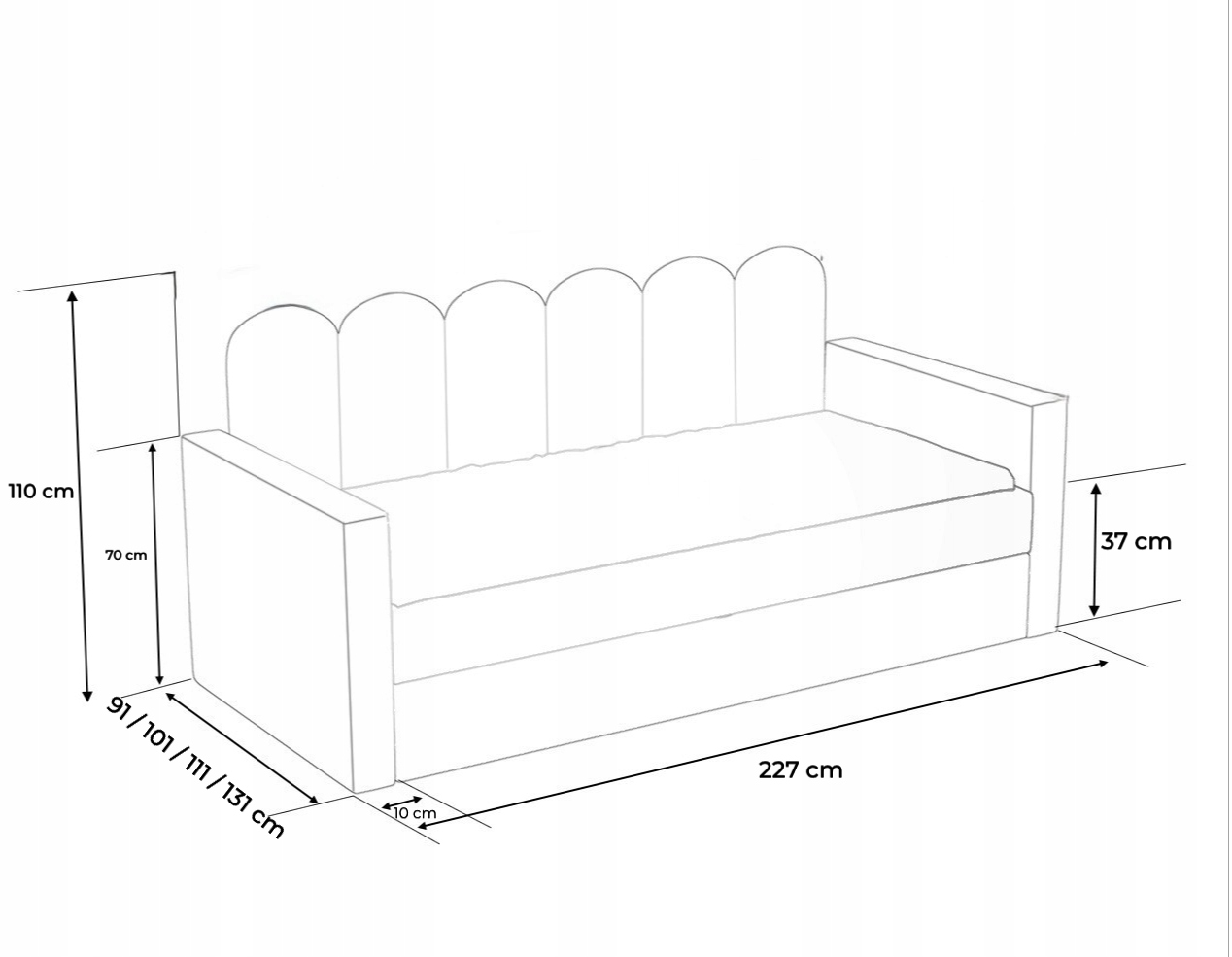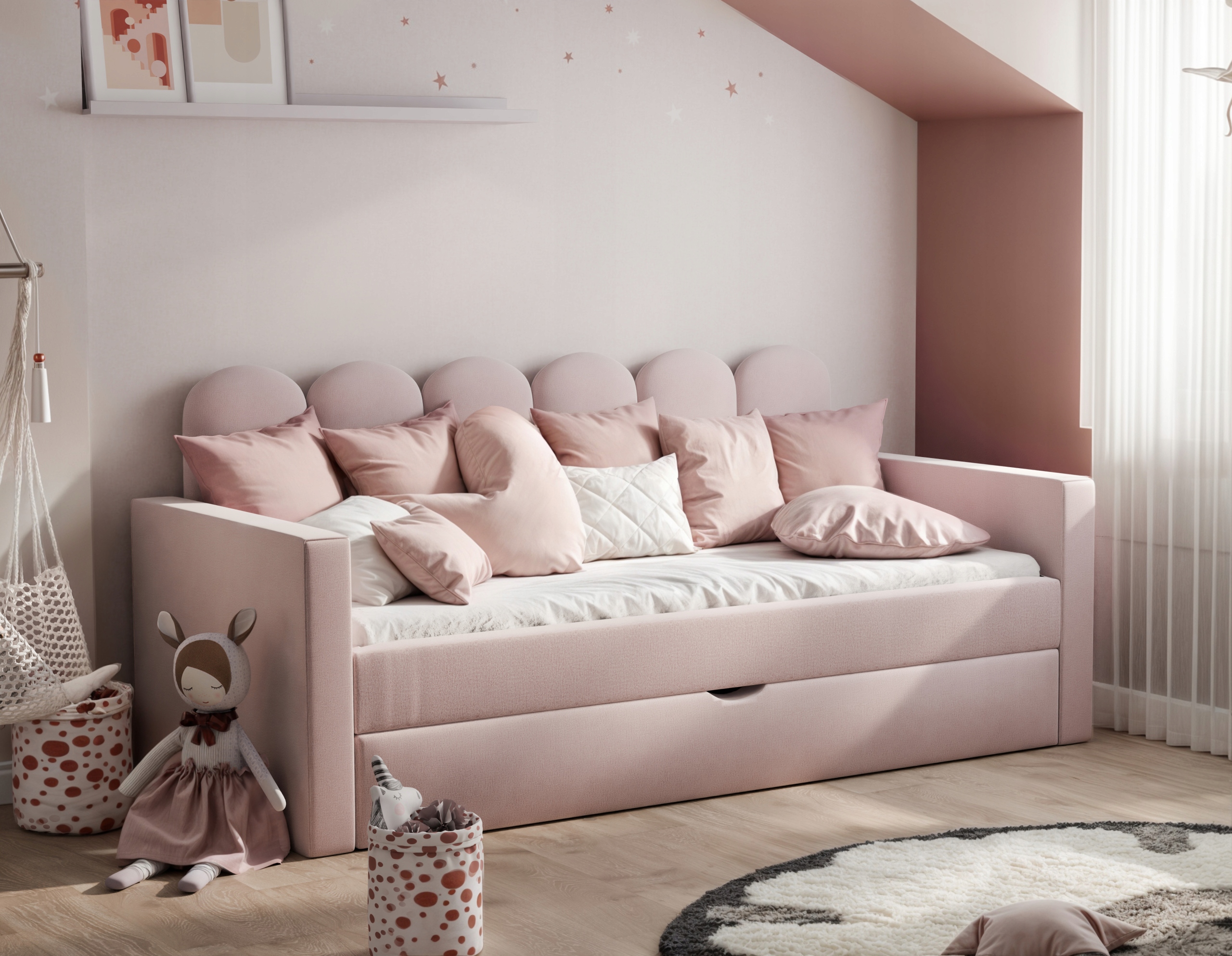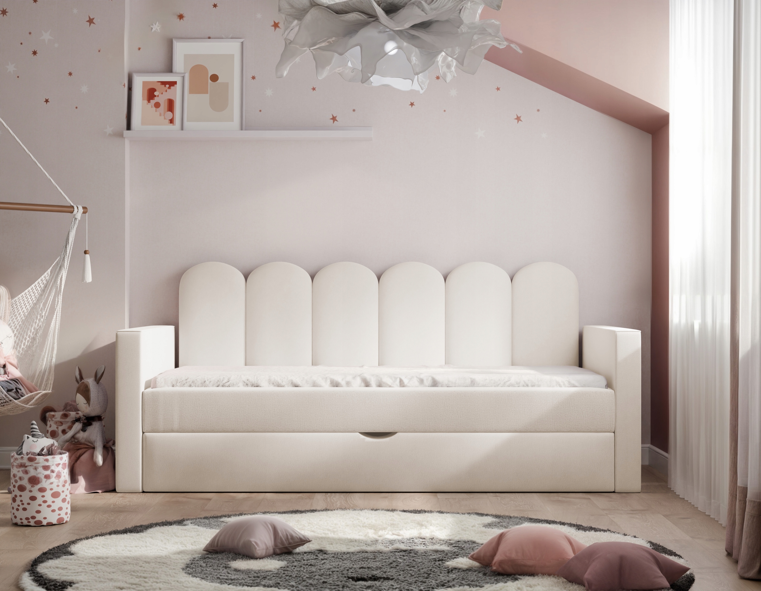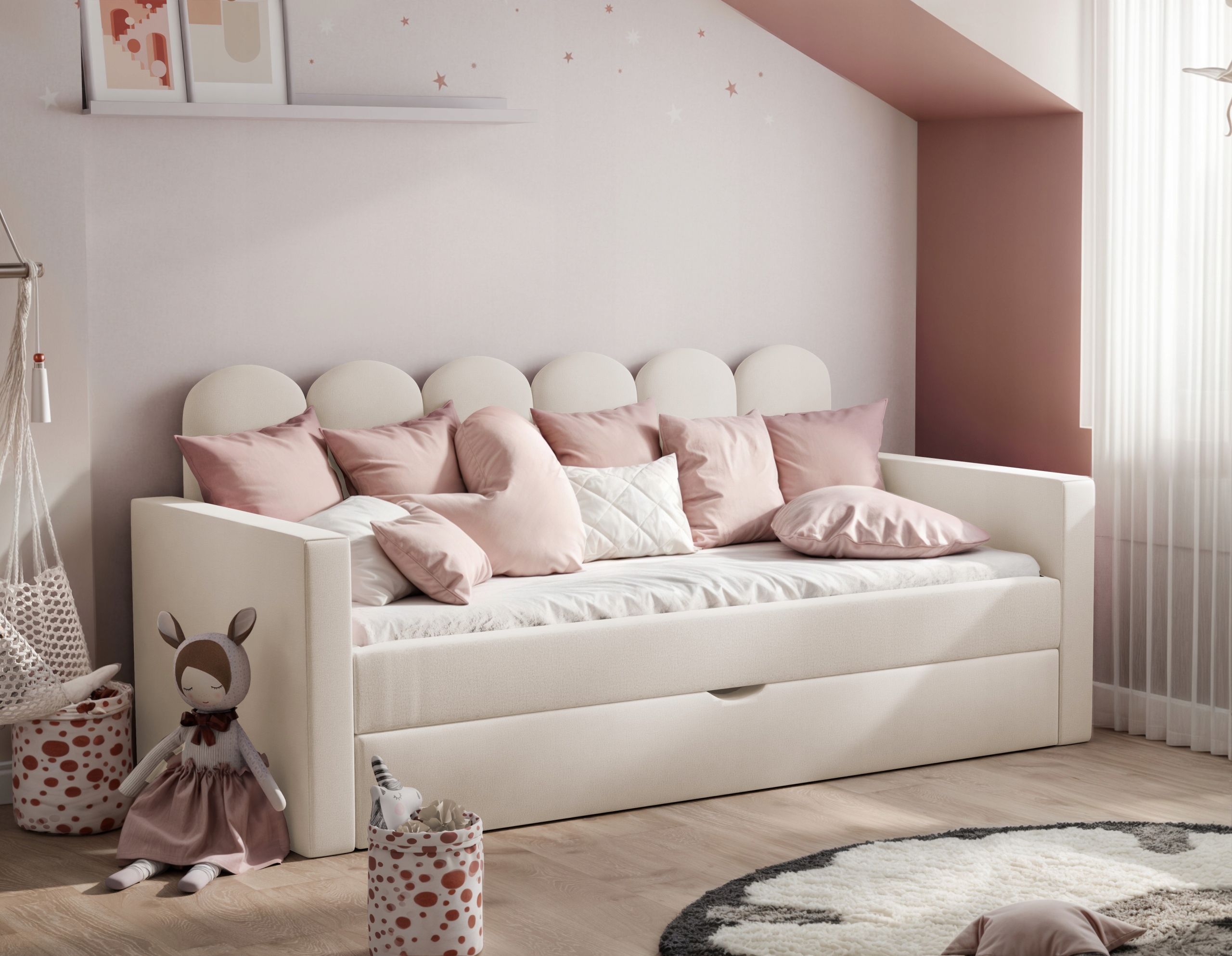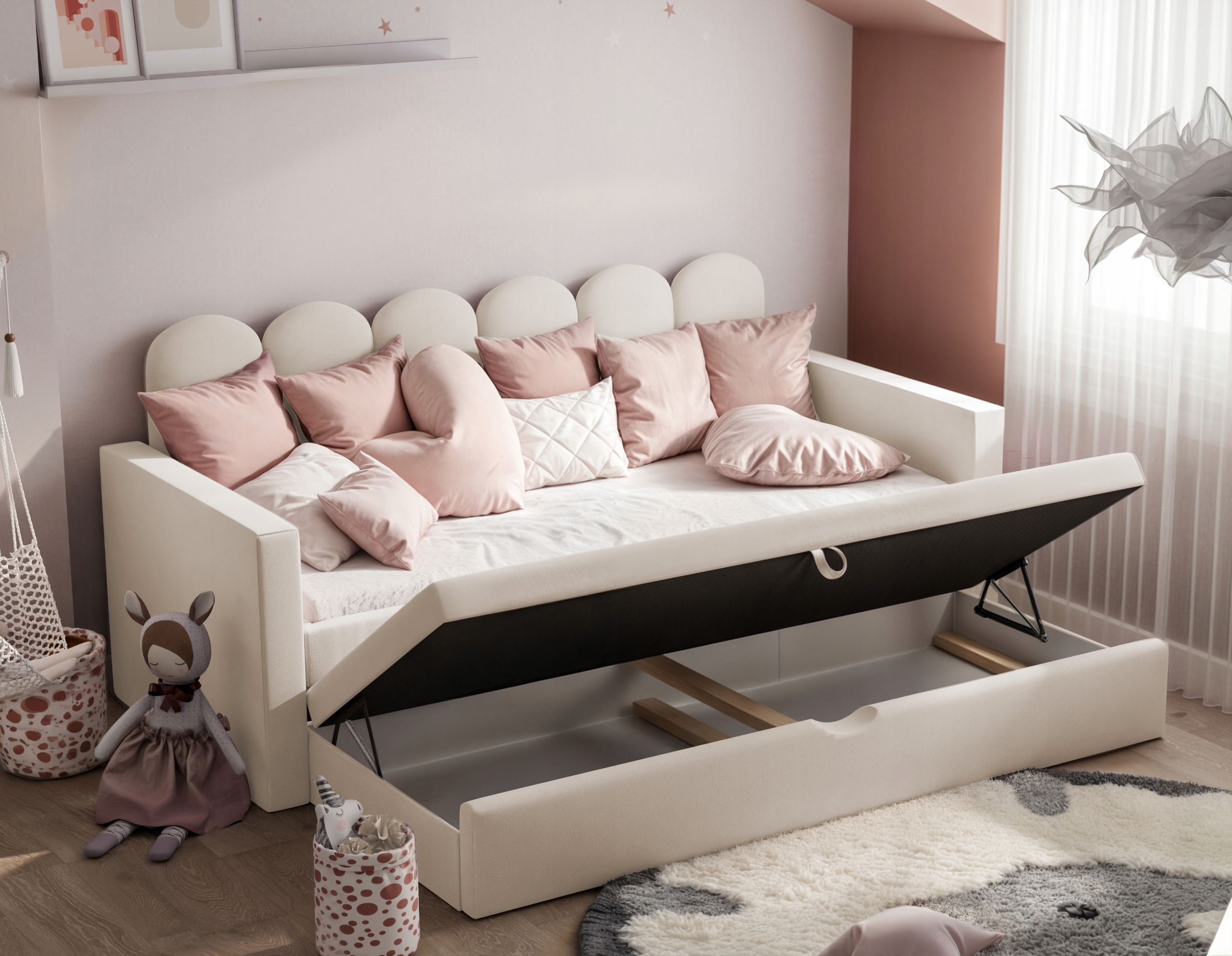 Model posiada pojemny schowek na pościel, który pozwala utrzymać porządek i pomieścić kołdry, poduszki czy inne tekstylia. Charakterystyczne zagłowie typu "płotek" nadaje mu uroku i tworzy przytulny klimat, a jednocześnie zapewnia bezpieczeństwo podczas użytkowania.