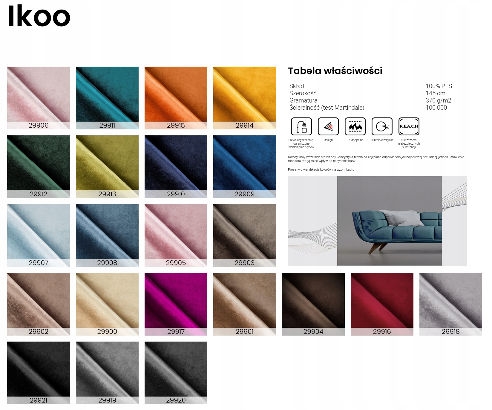 IKOO to wyjątkowa tkanina welurowa łączy w sobie piękno i praktyczność. Tkanina meblowa typu welur z subtelnym świetlnym połyskiem i cieniami tworzącymi ciekawą grę tonów barw. IKOO to znakomite połączenie piękna z funkcjonalnymi rozwiązaniami takimi jak wodoodporność (powoduje zwiększoną odporność na zabrudzenia) oraz trudnopalność. Materiał uzyskuje bardzo wysoki wynik odporności na ścieranie oraz dobrze znosi promienie słoneczne co zapobiega płowieniu.