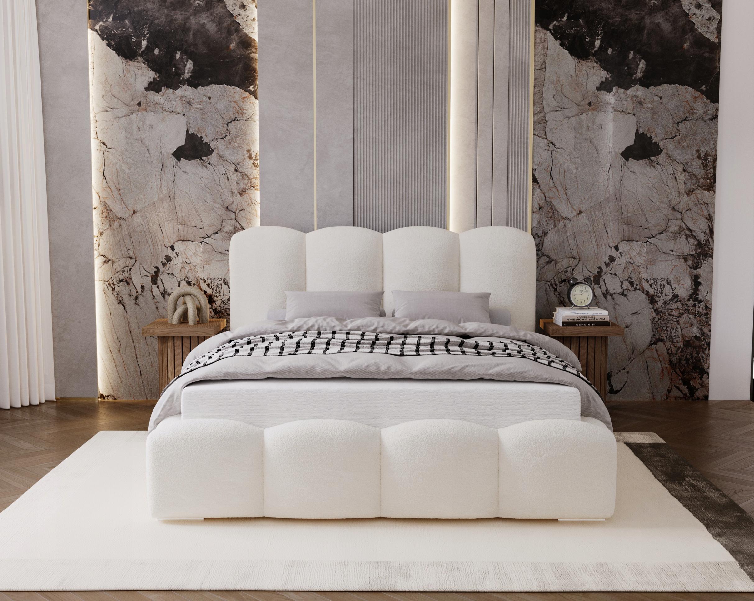 Łóżko zostało obite tkaniną boucle – miękki baranek, niezwykle przyjemną w dotyku i idealną do nowoczesnych wnętrz. Gruba, miękka pianka zastosowana na całej konstrukcji zapewnia wysoki komfort codziennego użytkowania oraz wygodny wypoczynek.