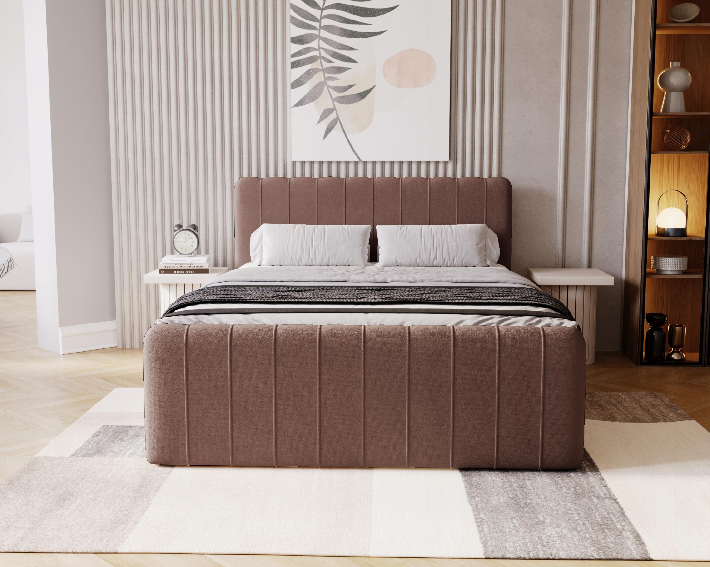 Niepowtarzalny, tapicerowany zagłówek z modnymi lamówkami to prawdziwa ozdoba każdej sypialni, która dodaje wnętrzu wyjątkowego charakteru. Spójny design dopełnia panel przedni, tworząc harmonijny, nowoczesny wygląd łóżka.