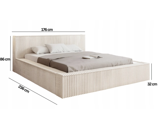 Łóżko tapicerowane Monza 140x200 to połączenie elegancji i komfortu. Wykonane na solidnym, grubym szkielecie, gwarantuje stabilność i trwałość. Obite jest miękką tkaniną sztruksową z grubymi prążkami, co nadaje mu wyjątkowy, stylowy wygląd i przytulny charakter. Łóżko sypialniane posiada praktyczny pojemnik na pościel, co ułatwia przechowywanie dodatkowych kołder i poduszek. Osadzone jest na niskich, chromowanych nogach o wysokości 2,5 cm, które dodają mu nowoczesnego, minimalistycznego wyglądu, a jednocześnie zapewniają stabilność. Idealne rozwiązanie do sypialni, gdzie komfort spotyka się z elegancją.