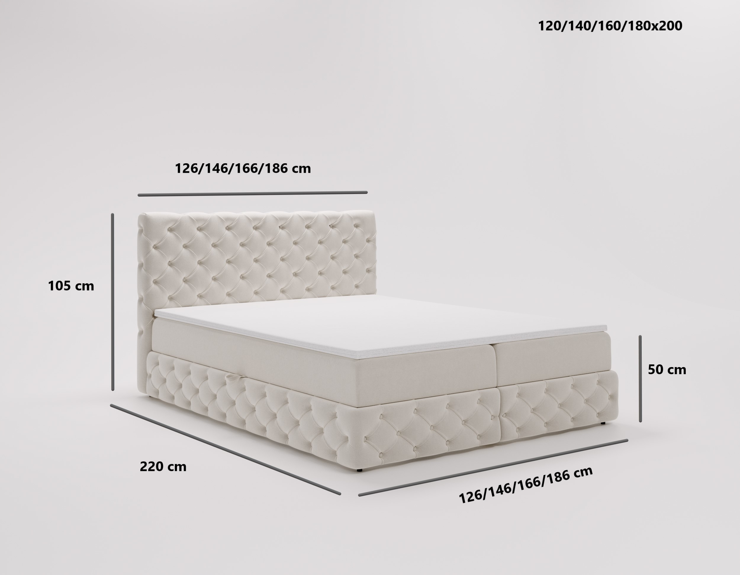 Dwa pojemne schowki z automatycznym otwieraniem sprężynowym sprawiają, że organizacja pościeli i koców jeszcze nigdy nie była tak prosta. Komfort snu zapewnia dodatkowy topper, który idealnie dopasowuje się do ciała, zapewniając relaks na najwyższym poziomie – zawsze świeży i łatwy do utrzymania w czystości. Materac główny o grubości 20 cm opiera się na systemie sprężyn bonell zapewnia trwałość oraz idealne wsparcie dla ciała podczas snu. Warstwa pianki dodatkowo podnosi komfort, dopasowując się do kształtu ciała.