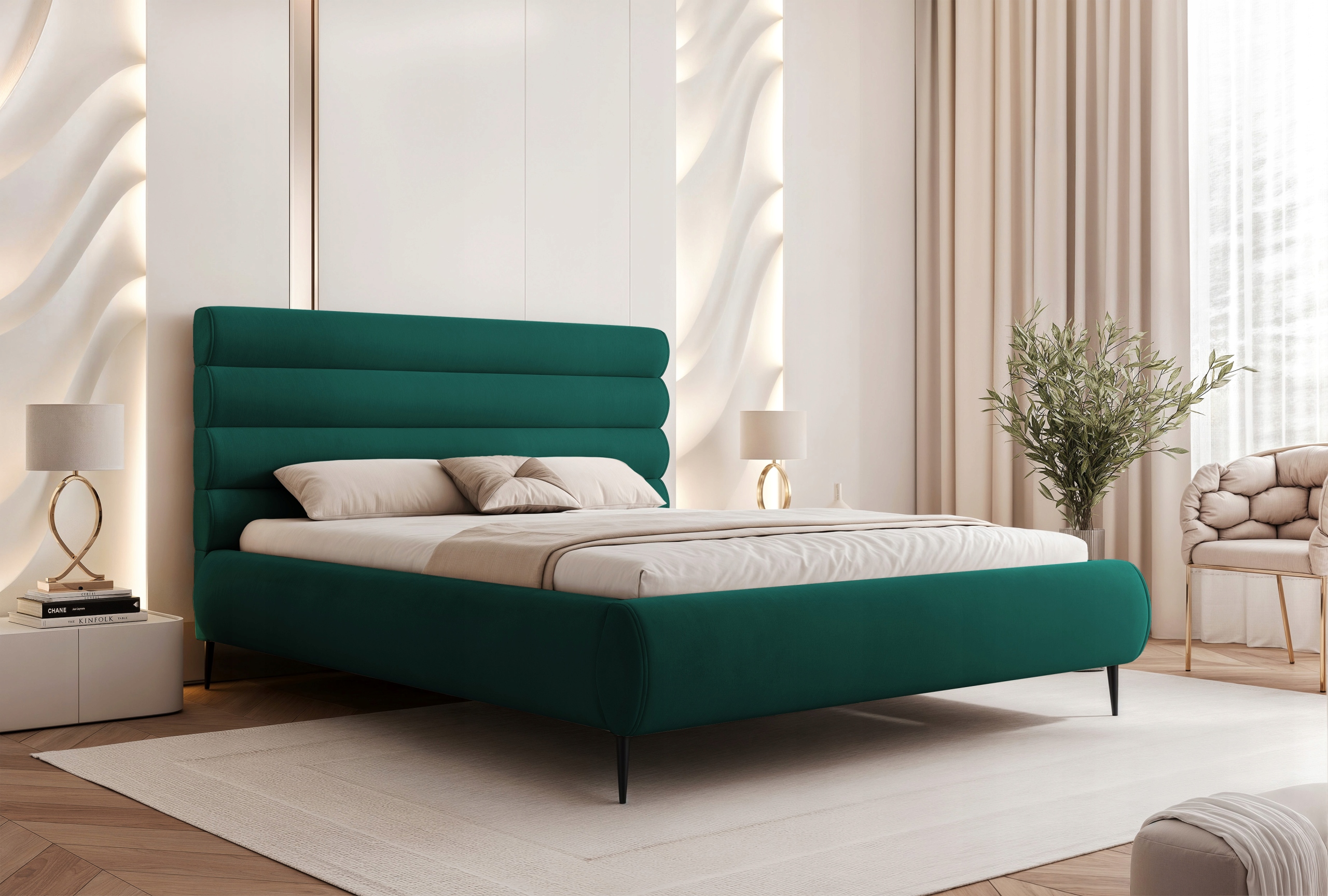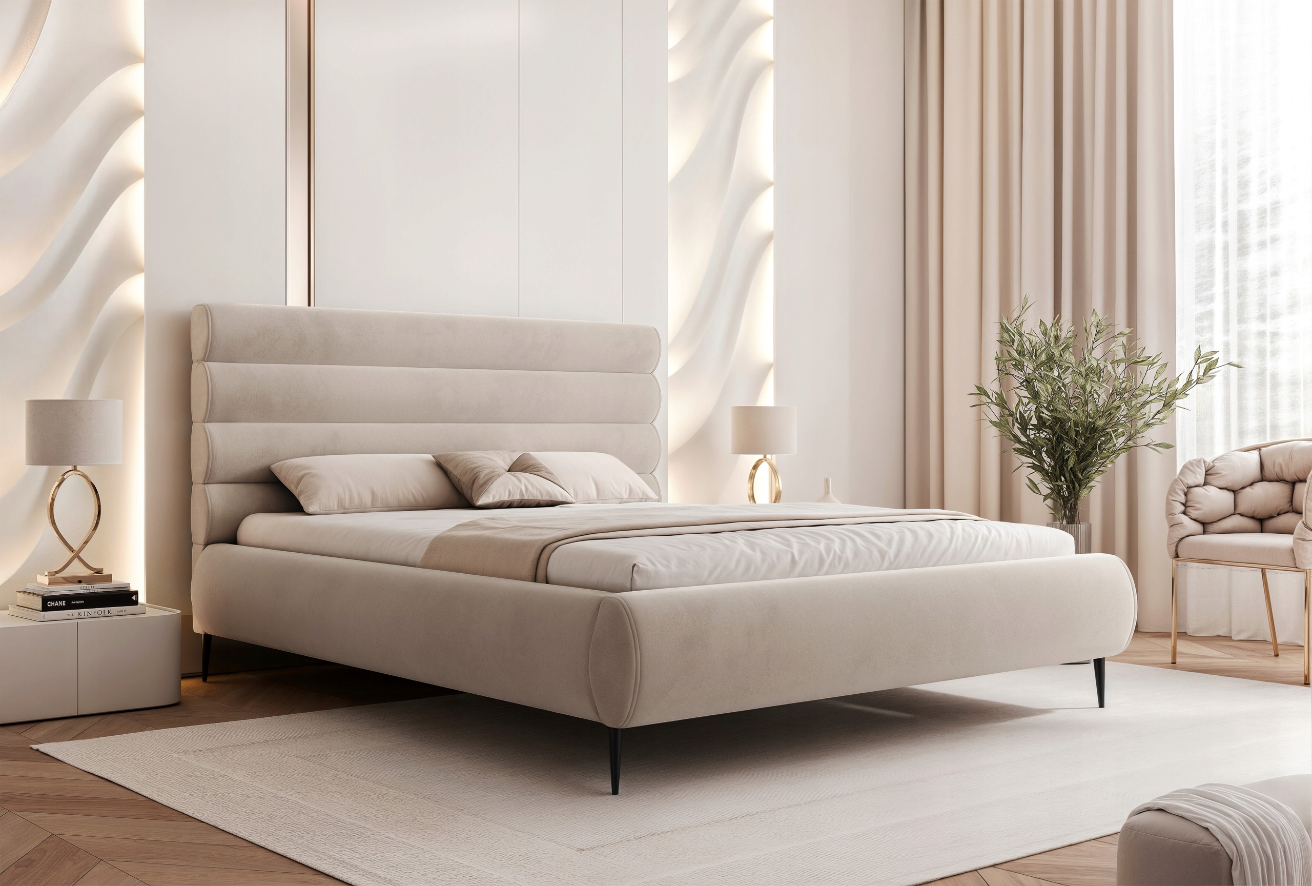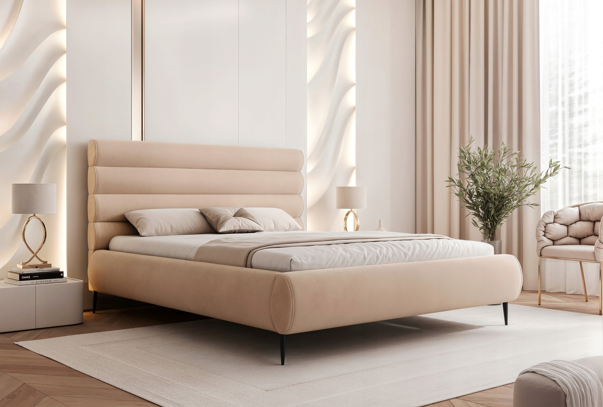 Łóżko sypialniane 120x200 Marbela II to idealny wybór dla osób ceniących nowoczesny design, komfort i wysoką jakość wykonania. Charakterystyczne poziome półwałki na wezgłowiu oraz obłe kształty nadają mu luksusowy wygląd, a smukłe wysokie metalowe nogi podkreślają jego lekkość i elegancję.