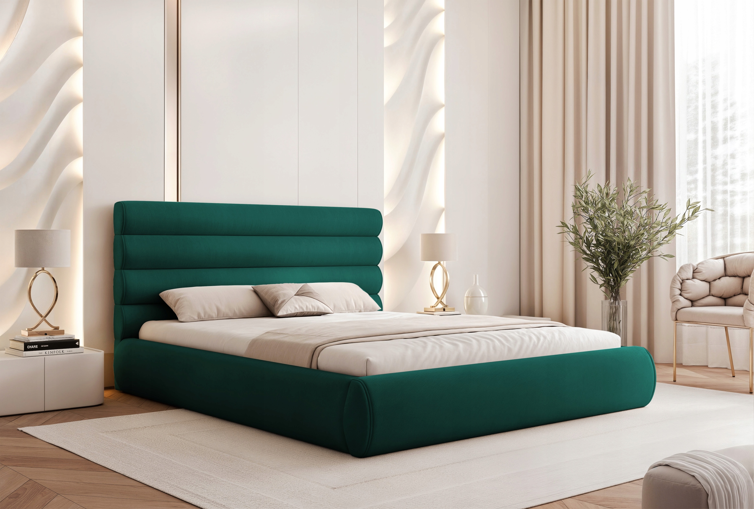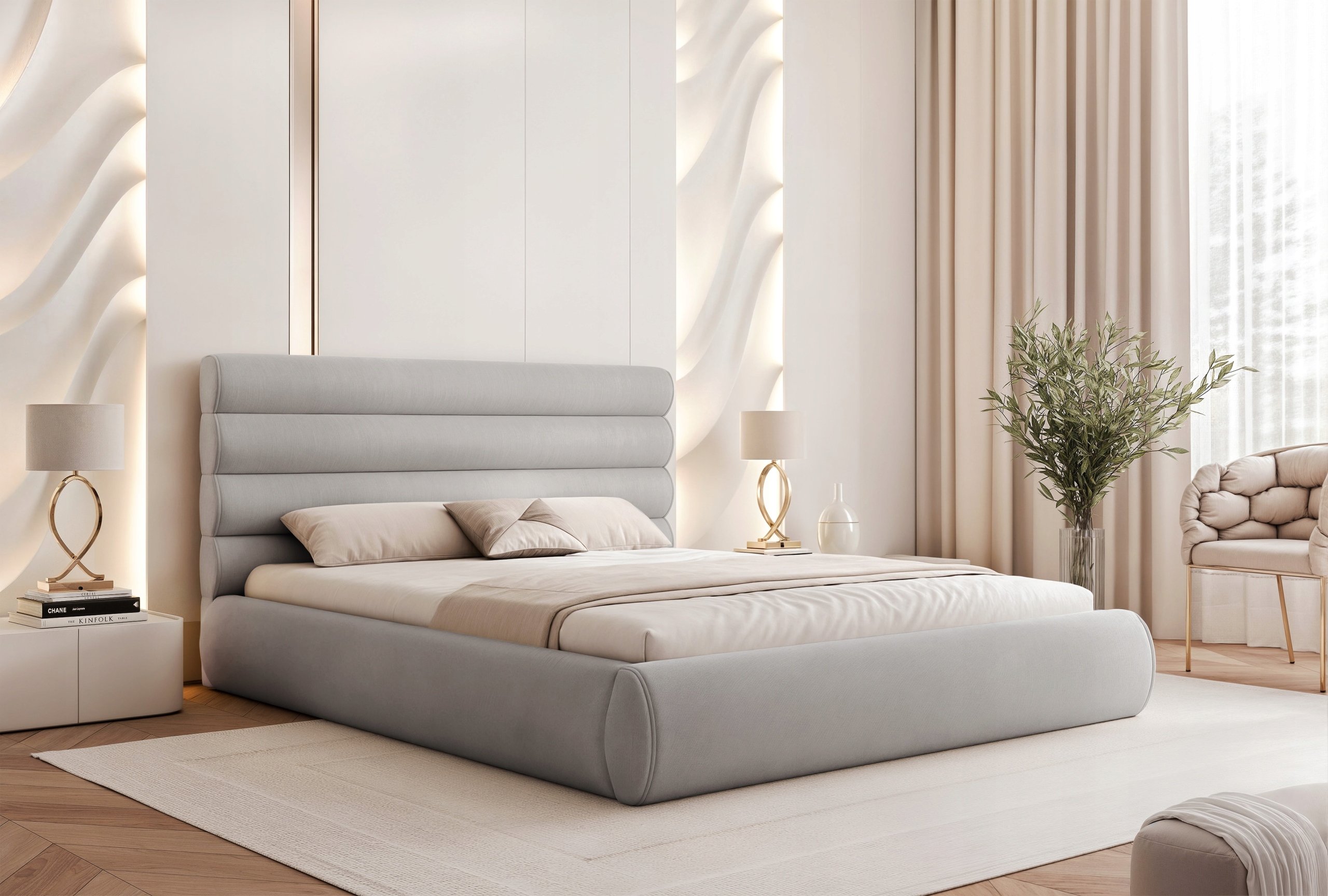 Łóżko sypialniane Marbela to propozycja dla osób ceniących nowoczesny design, wygodę i dopracowane detale. Charakterystyczne poziome półwałki na wezgłowiu oraz obłe kształty nadają mu eleganckiego wyglądu, a całość prezentuje się lekko i stylowo.