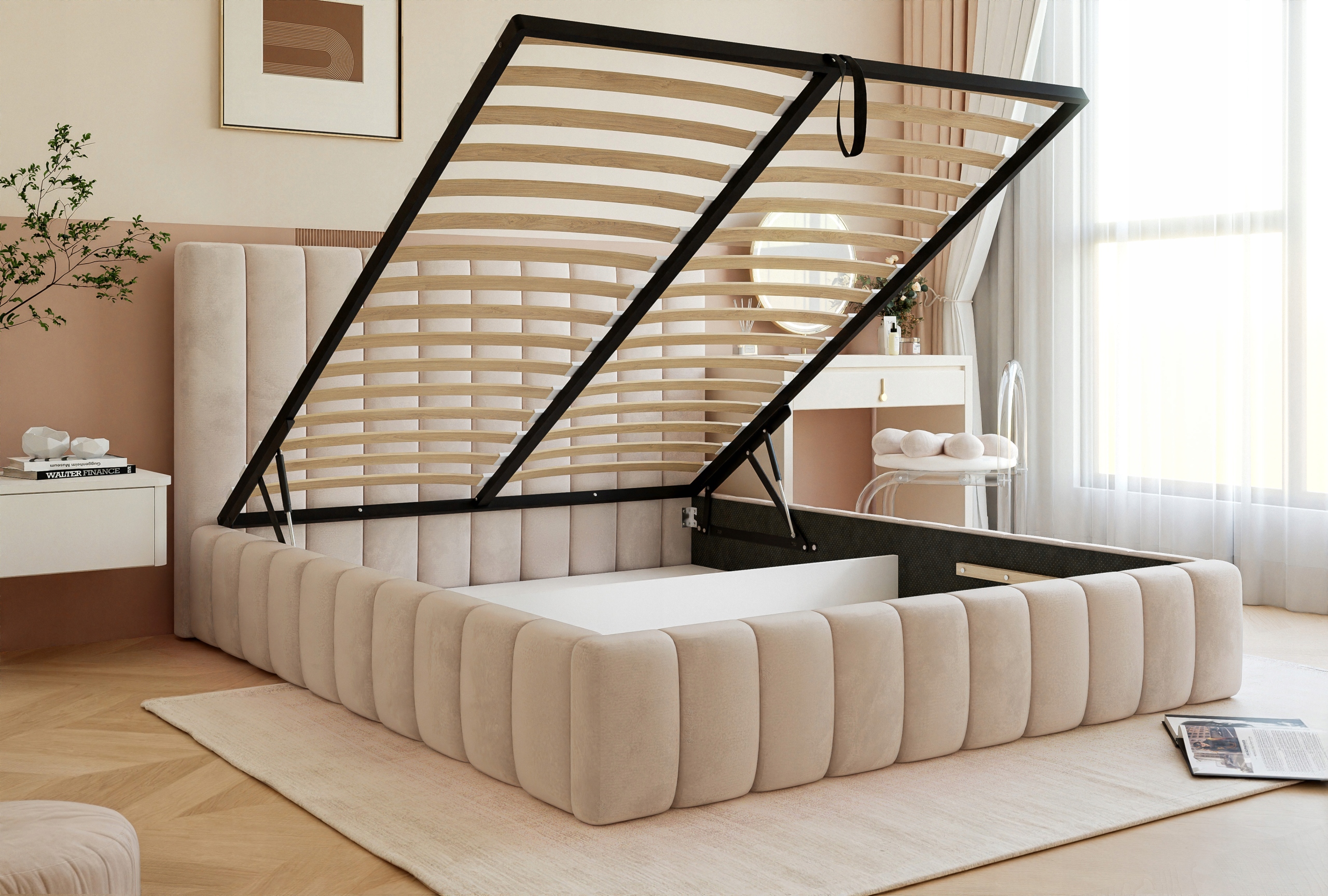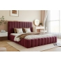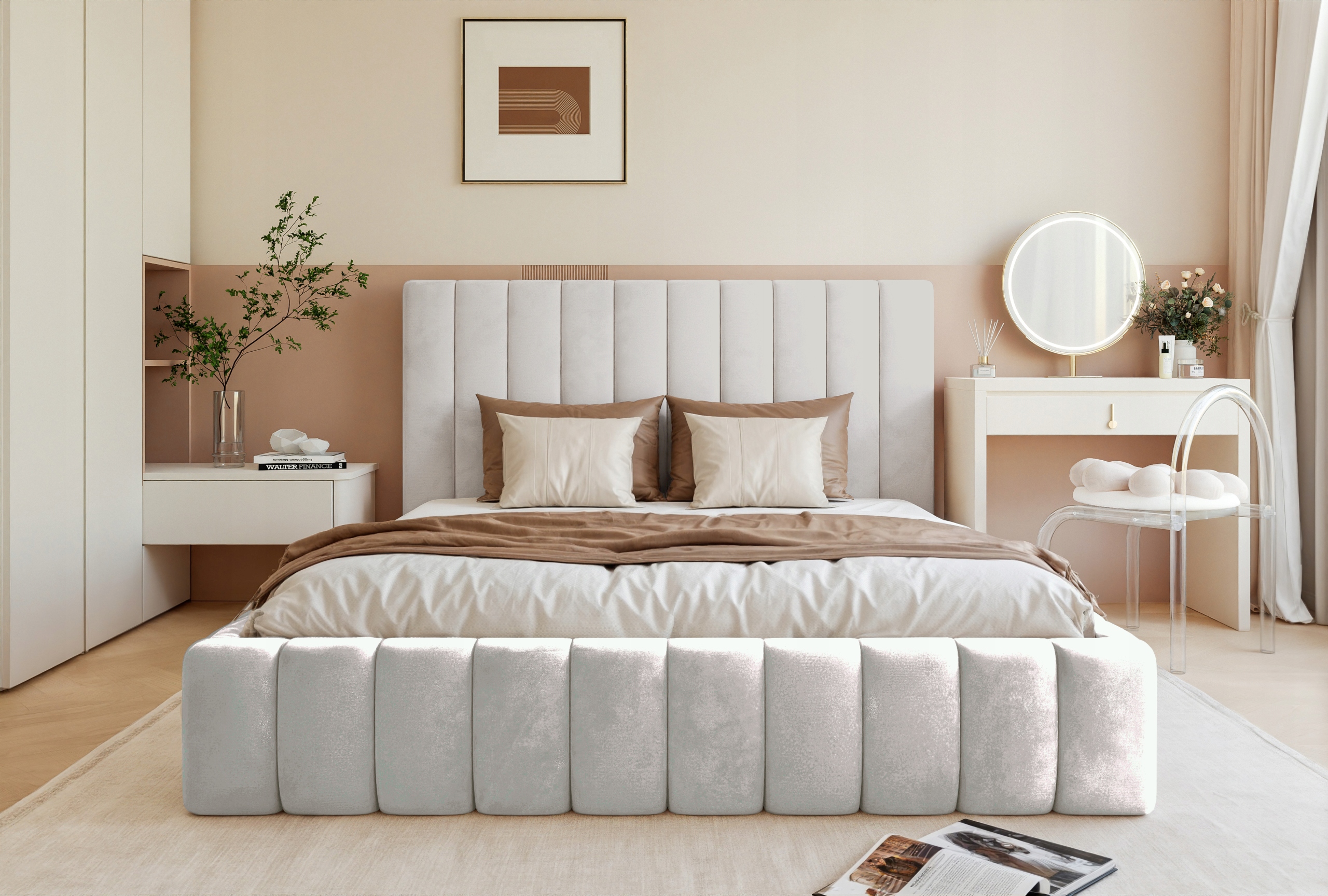 Łóżko tapicerowane Tina 140x200 to elegancki i funkcjonalny wybór do każdej sypialni. Wyposażone w pojemnik na pościel, zapewnia dodatkową przestrzeń do przechowywania kołder i poduszek. Osadzone jest na niskich ślizgach, co nadaje mu stabilności i minimalistycznego wyglądu. Zagłówek łóżka zdobią pionowe pasy wykonane z grubej pianki, które dodają mu stylu oraz zapewniają wygodę podczas wypoczynku. Konstrukcja oparta na cienkim szkielecie typu slim sprawia, że łóżko jest lekkie, ale jednocześnie wytrzymałe i solidne.