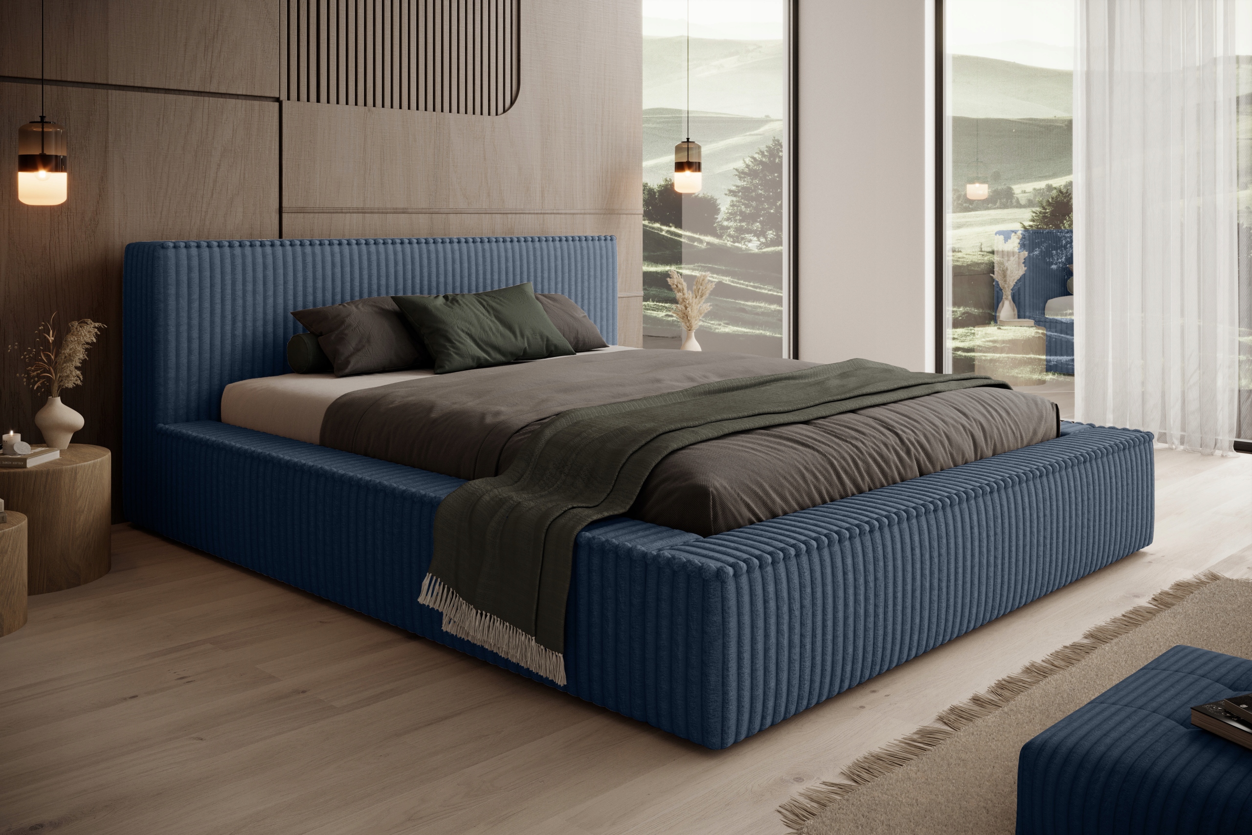 Łóżko tapicerowane Monza 160x200 to połączenie elegancji i komfortu. Wykonane na solidnym, grubym szkielecie, gwarantuje stabilność i trwałość. Obite jest miękką tkaniną sztruksową z grubymi prążkami, co nadaje mu wyjątkowy, stylowy wygląd i przytulny charakter. Łóżko sypialniane posiada praktyczny pojemnik na pościel, co ułatwia przechowywanie dodatkowych kołder i poduszek. Osadzone jest na niskich, chromowanych nogach o wysokości 2,5 cm, które dodają mu nowoczesnego, minimalistycznego wyglądu, a jednocześnie zapewniają stabilność. Idealne rozwiązanie do sypialni, gdzie komfort spotyka się z elegancją.