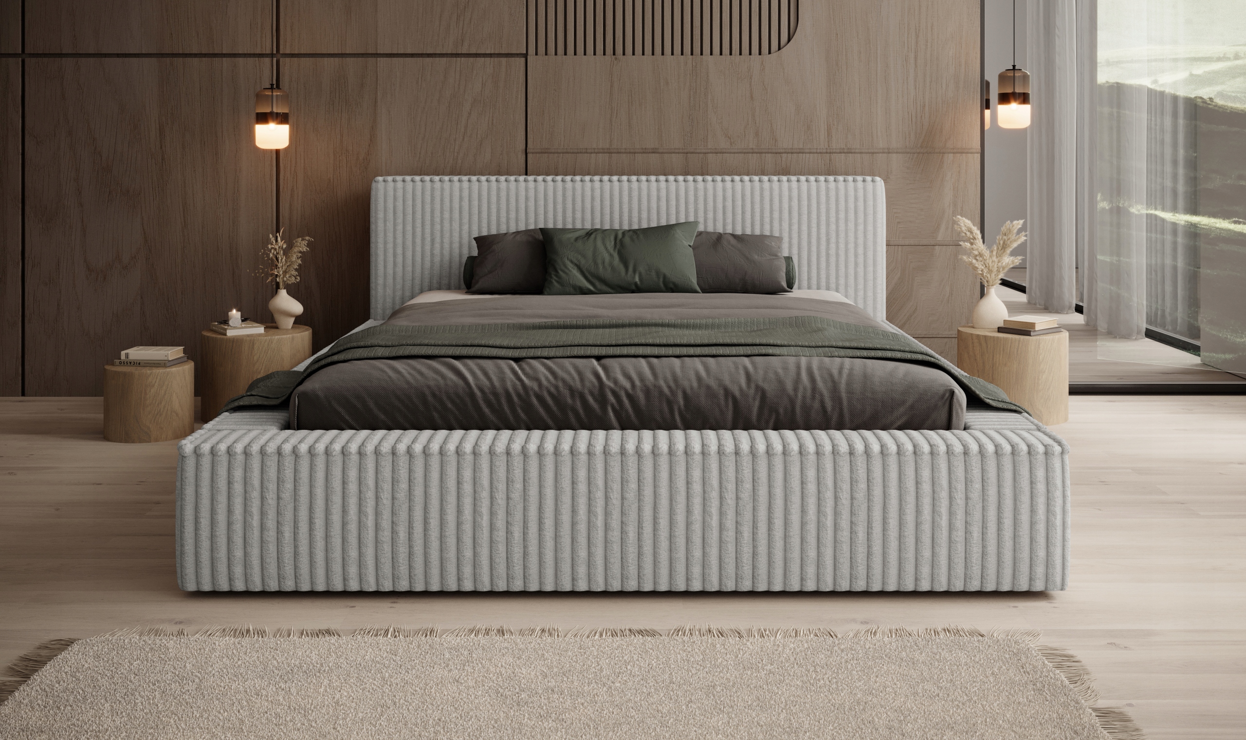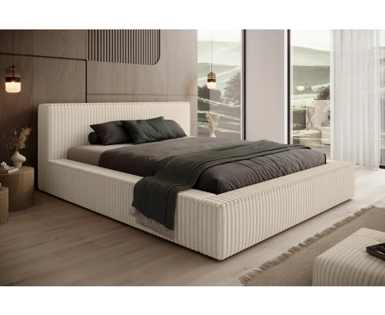 Łóżko tapicerowane Monza 180x200 to połączenie elegancji i komfortu. Wykonane na solidnym, grubym szkielecie, gwarantuje stabilność i trwałość. Obite jest miękką tkaniną sztruksową z grubymi prążkami, co nadaje mu wyjątkowy, stylowy wygląd i przytulny charakter. Łóżko sypialniane posiada praktyczny pojemnik na pościel, co ułatwia przechowywanie dodatkowych kołder i poduszek. Osadzone jest na niskich, chromowanych nogach o wysokości 2,5 cm, które dodają mu nowoczesnego, minimalistycznego wyglądu, a jednocześnie zapewniają stabilność. Idealne rozwiązanie do sypialni, gdzie komfort spotyka się z elegancją.