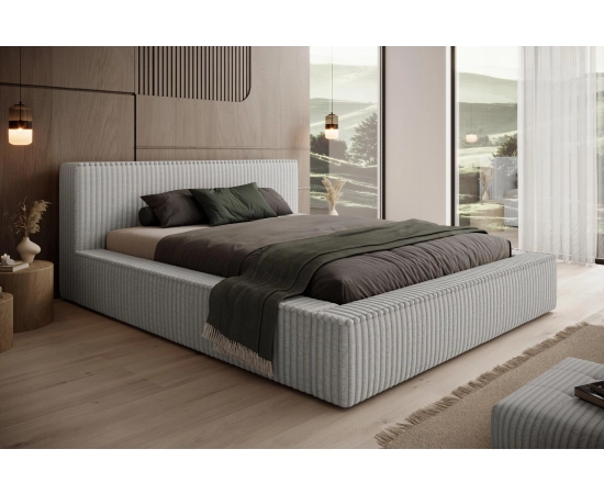 Łóżko tapicerowane Monza 120x200 to połączenie elegancji i komfortu. Wykonane na solidnym, grubym szkielecie, gwarantuje stabilność i trwałość. Obite jest miękką tkaniną sztruksową z grubymi prążkami, co nadaje mu wyjątkowy, stylowy wygląd i przytulny charakter. Łóżko sypialniane posiada praktyczny pojemnik na pościel, co ułatwia przechowywanie dodatkowych kołder i poduszek. Osadzone jest na niskich, chromowanych nogach o wysokości 2,5 cm, które dodają mu nowoczesnego, minimalistycznego wyglądu, a jednocześnie zapewniają stabilność. Idealne rozwiązanie do sypialni, gdzie komfort spotyka się z elegancją.