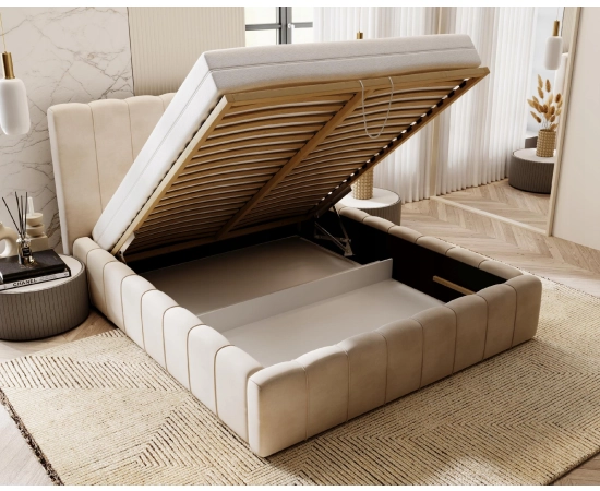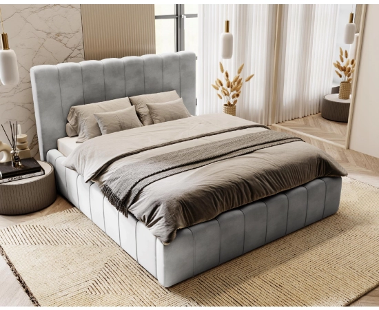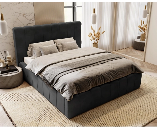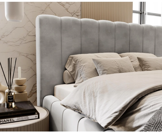 Łóżko Sofia to łóżko tapicerowane, które zniewala swoim wyglądem już od pierwszej sekundy. Wezgłowie wraz z bokami i przodem mebla zostało przeszyte pionowymi liniami, co nadaje temu modelowi niepowtarzalnego designu. Dostępność różnorodnych odcieni tkanin pozwala dopasować łóżko do Twoich osobistych preferencji i stylu, dzięki czemu stanie się ono harmonijnym elementem każdego wnętrza. W dodatku, schowek na pościel pozwoli utrzymać porządek w sypialni, czyniąc to łóżko nie tylko stylowym, ale także funkcjonalnym wyborem.