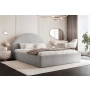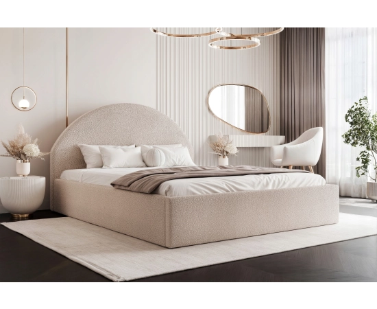 Łóżko sypialniane Velora 120x200 to nowoczesna propozycja, która wyróżnia się eleganckim designem i funkcjonalnością. Posiada pojemny schowek na pościel, idealny do przechowywania dodatkowej kołdry czy poduszek. Stylowe, półokrągłe wezgłowie w połączeniu z wąskimi bokami nadaje całości lekkiego i nowoczesnego charakteru. Mebel został osadzony na praktycznych ślizgach, co ułatwia jego przesuwanie i ustawienie. Tapicerka z tkaniny boucle oraz miękkiego veluru nie tylko pięknie się prezentuje, ale także zapewnia wyjątkowy komfort użytkowania. W zestawie znajduje się solidny stelaż drewniany, który zapewnia odpowiednie podparcie dla materaca. Tapicerowane łóżko Velora to doskonały wybór dla osób ceniących nowoczesny styl i wygodę.