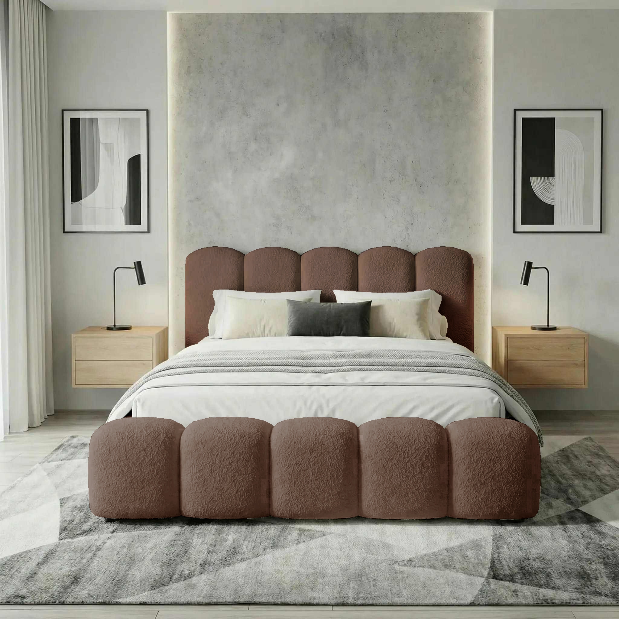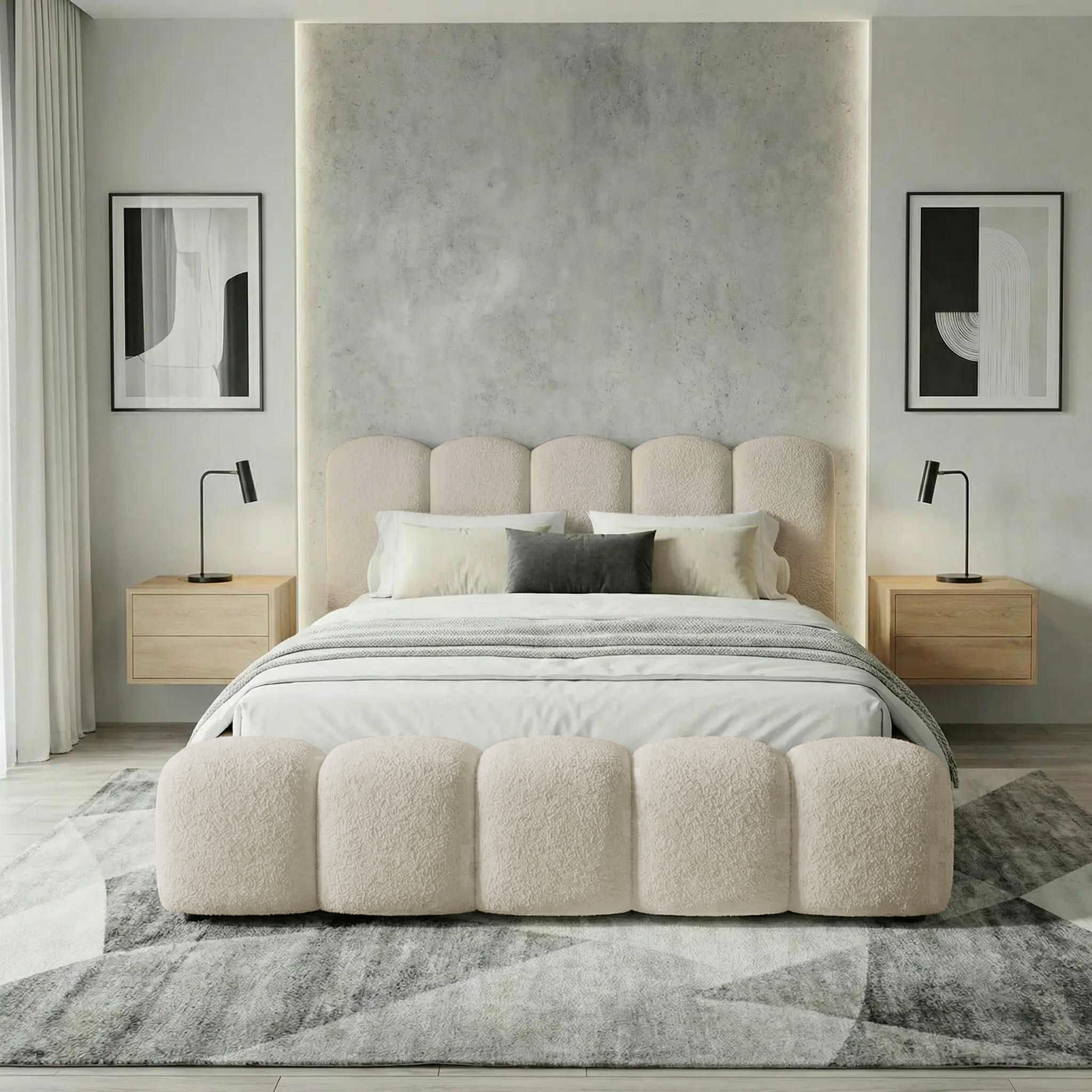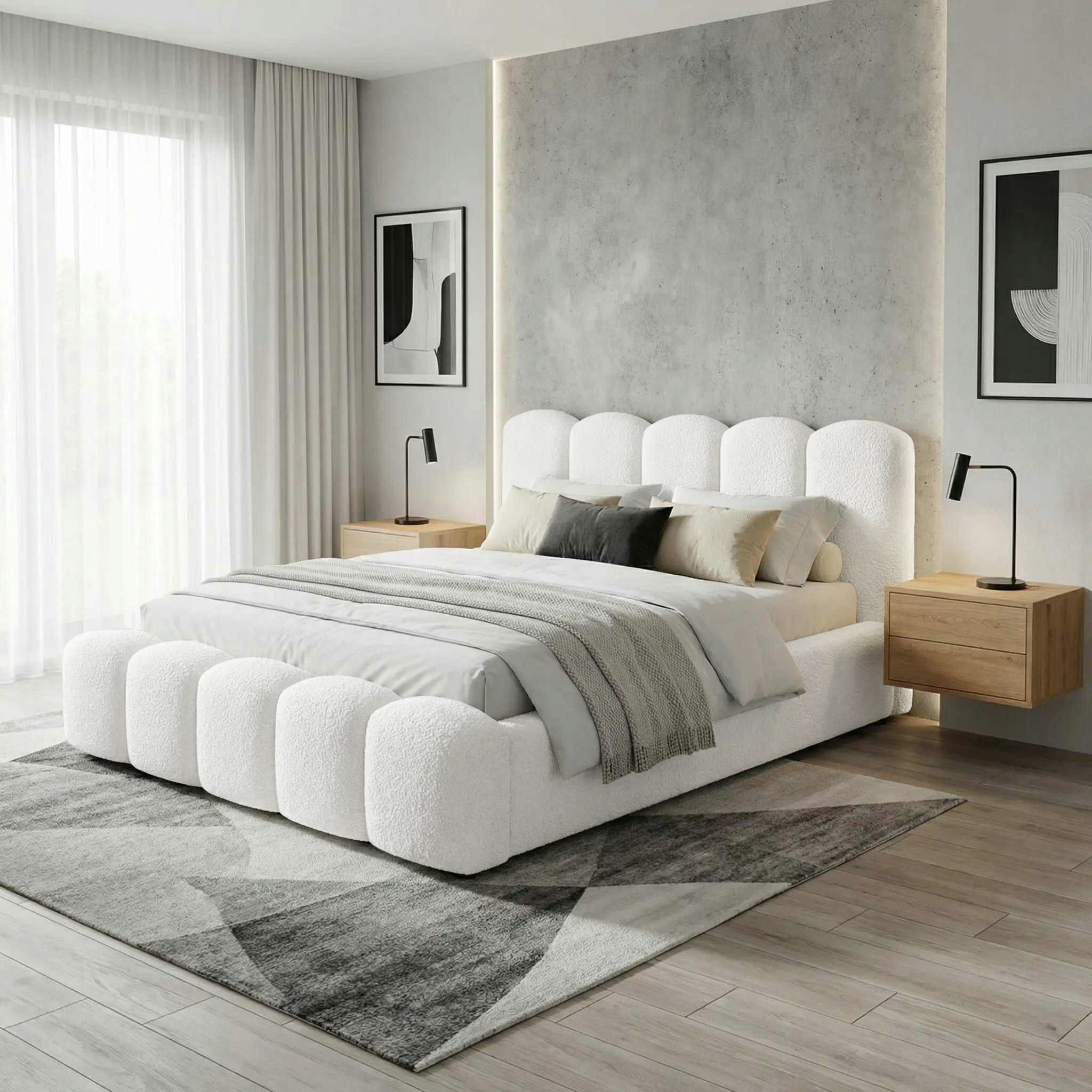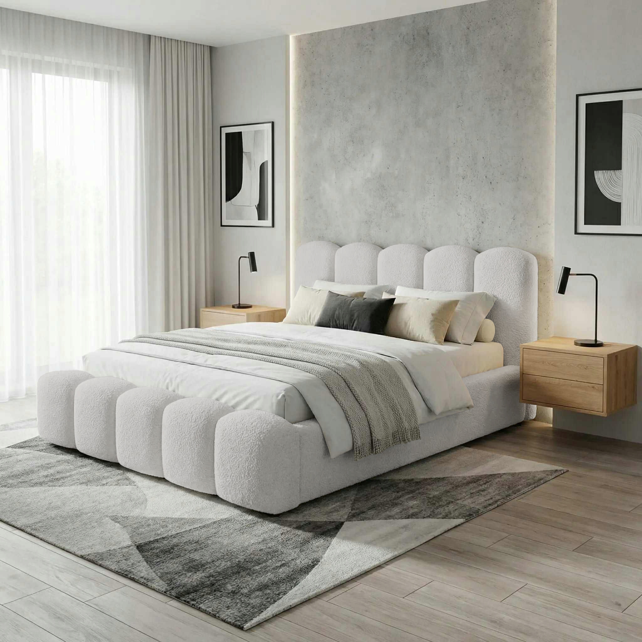 Łóżko zostało obite modną tkaniną typu baranek (boucle), niezwykle miękką i przyjemną w dotyku. Wewnątrz znajduje się drewniany stelaż na sprężynach, który zapewnia stabilne podparcie materaca i komfortowy sen.