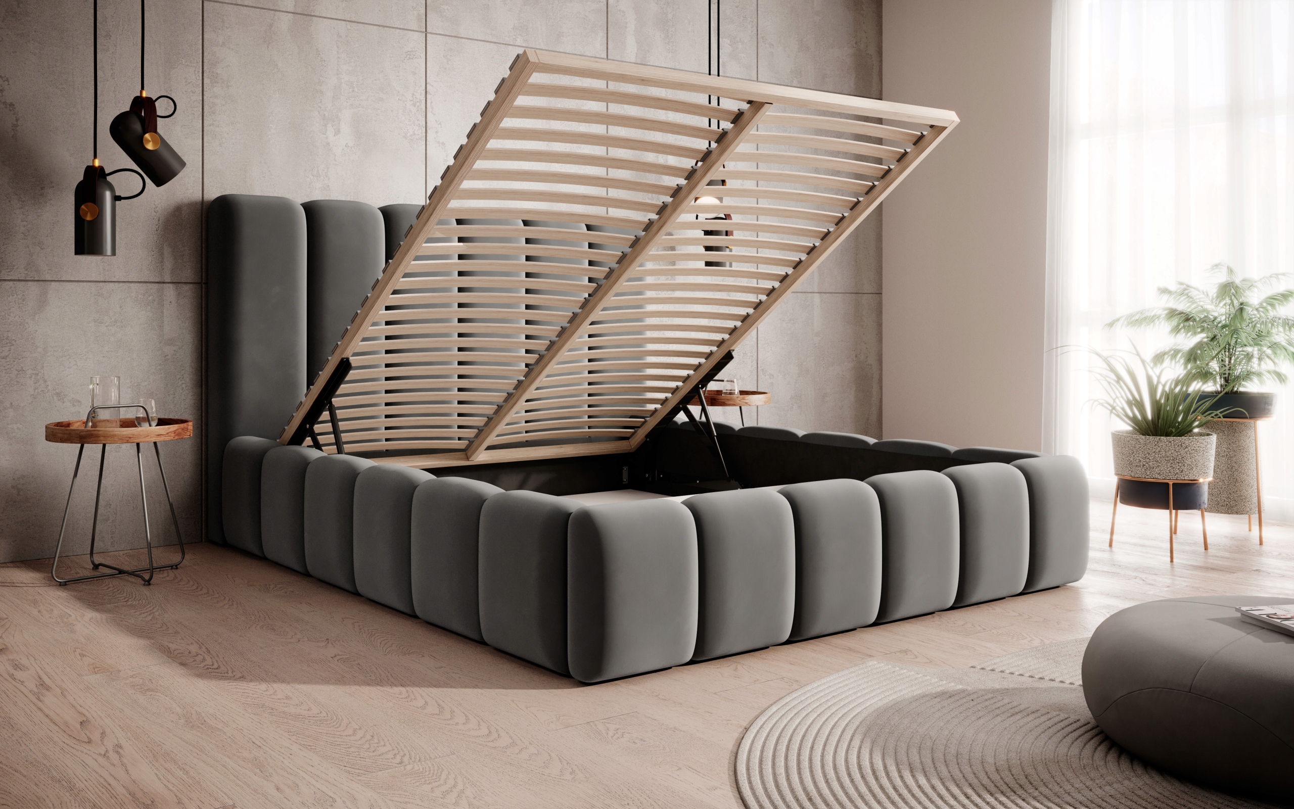Jednym z najważniejszych atutów tego łóżka jest duży pojemnik na pościel, umieszczony wewnątrz ramy pokrytego wewnątrz czarną włókniną, w którym można schować poduszki, pościel oraz inne akcesoria. W zestawie z łóżkiem znajduje się podnoszony stelaż drewniany ze sprężynami (możliwość dopłaty do stelaża metalowego z podnośnikami gazowymi) wykonany z solidnych listew sprężynujących, który sprosta wymaganiom każdego użytkownika.