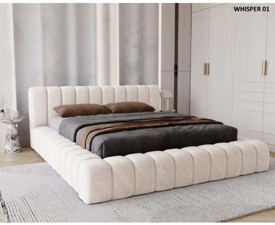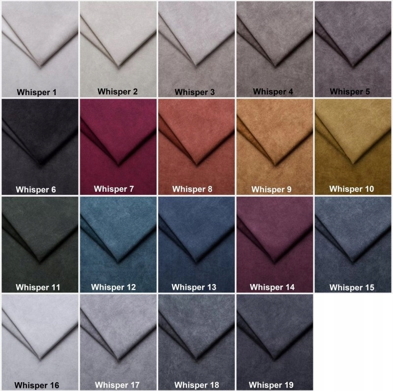 WHISPER – tkanina welurowa, przyjemna w dotyku i bogatej kolorystyce. Materiał cechuje się subtelnym cieniowaniem co daje mu ciekawy efekt, posiada specjalny podkład stabilizujący - wzmacniający, który pozwala uniknąć niechcianego rozciągania. Tkanina obiciowa, bardzo wytrzymała, charakteryzuje się wysoką odpornością na użytkowanie