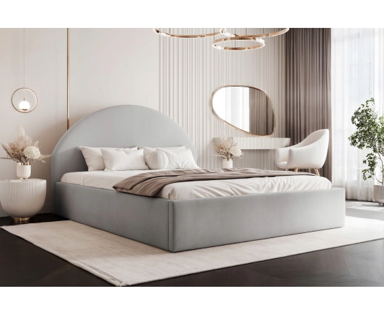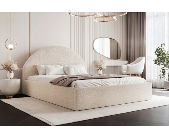 Łóżko sypialniane Velora 180x200 to nowoczesna propozycja, która wyróżnia się eleganckim designem i funkcjonalnością. Posiada pojemny schowek na pościel, idealny do przechowywania dodatkowej kołdry czy poduszek. Stylowe, półokrągłe wezgłowie w połączeniu z wąskimi bokami nadaje całości lekkiego i nowoczesnego charakteru. Mebel został osadzony na praktycznych ślizgach, co ułatwia jego przesuwanie i ustawienie. Tapicerka z tkaniny boucle oraz miękkiego veluru nie tylko pięknie się prezentuje, ale także zapewnia wyjątkowy komfort użytkowania. W zestawie znajduje się solidny stelaż drewniany, który zapewnia odpowiednie podparcie dla materaca. Tapicerowane łóżko Velora to doskonały wybór dla osób ceniących nowoczesny styl i wygodę.