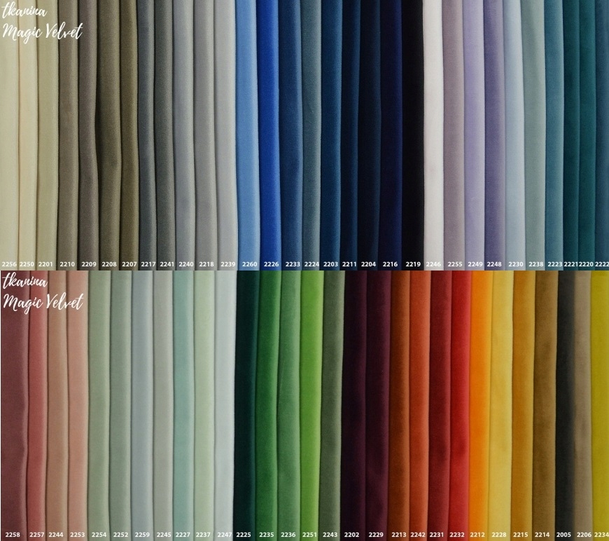 Magic Velvet to niezwykle puszysta oraz miękka w dotyku tkanina obiciowa na meble, poduszki i zasłony. Łatwa w utrzymaniu czystości. Pluszowy welwet jest jednocześnie wytrzymały na zadrapania i odporny na zwierzęta. Delikatnie odbija światło dając charakterystyczny i subtelny połysk.