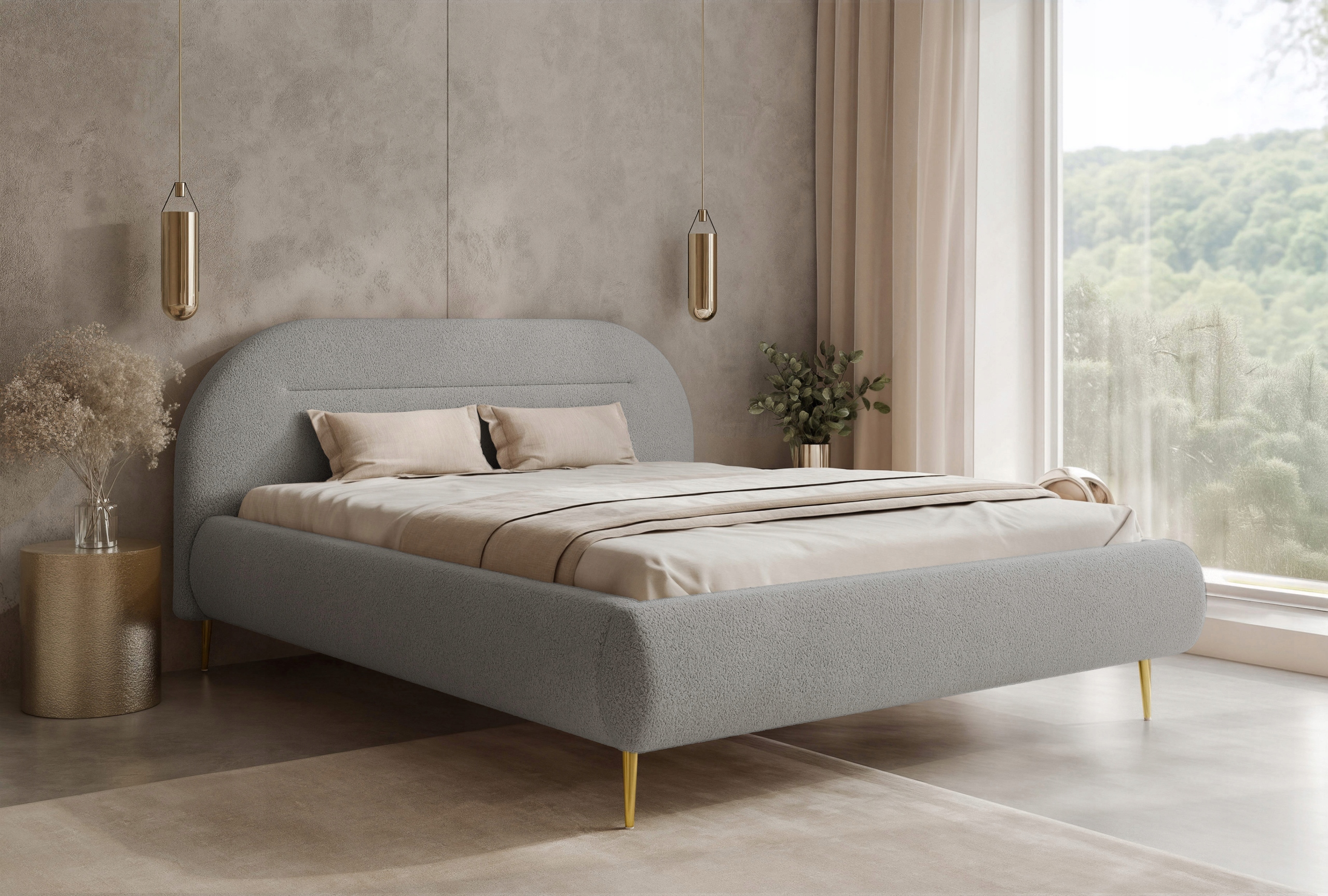 Łóżko tapicerowane Apolline II to nowoczesne i eleganckie łóżko sypialniane 120x200, które wyróżnia się modnym półokrągłym wezgłowiem oraz subtelnie obłą ramą, nadającą wnętrzu lekkości i przytulnego charakteru. Model został obity miękką, przyjemną w dotyku tkaniną pluszową Monte, która podkreśla jego stylowy wygląd.