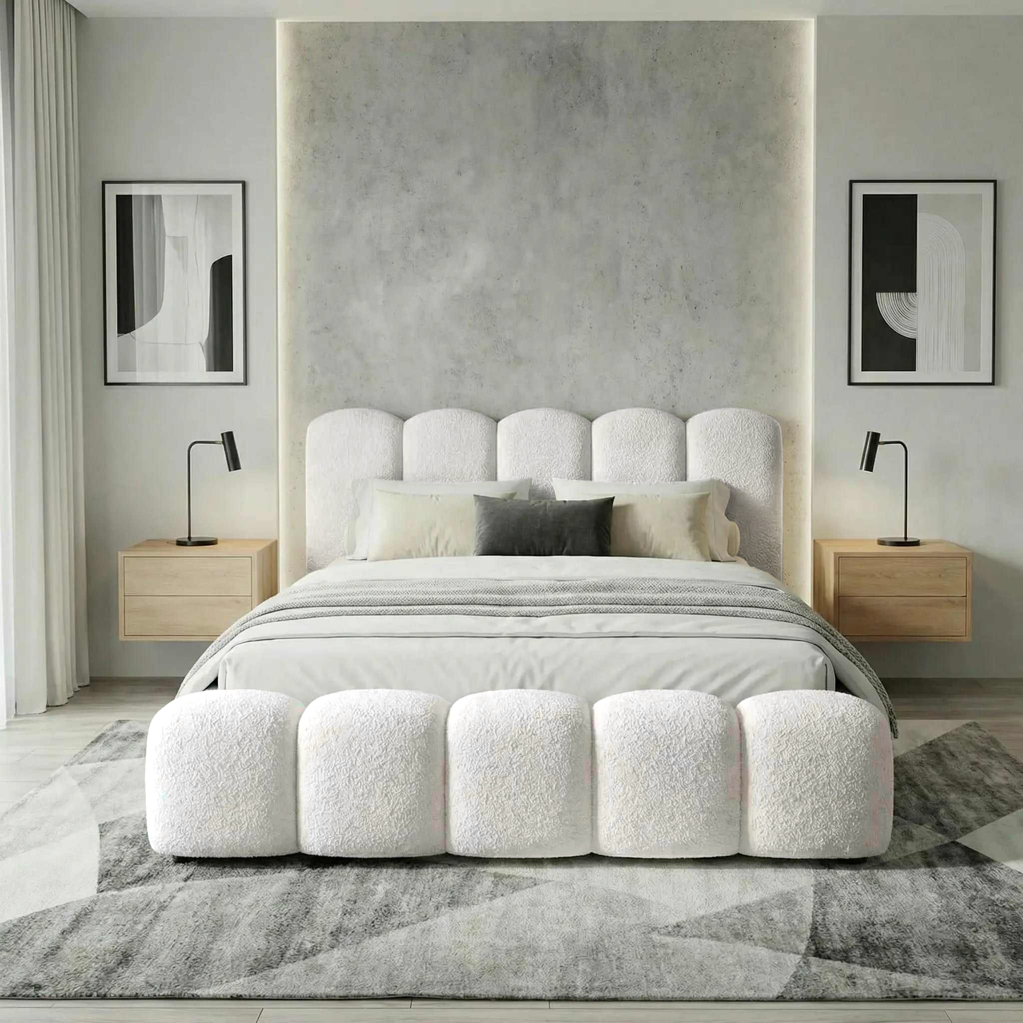 Łóżko zostało obite modną tkaniną typu baranek (boucle), niezwykle miękką i przyjemną w dotyku. Wewnątrz znajduje się drewniany stelaż na sprężynach, który zapewnia stabilne podparcie materaca i komfortowy sen.