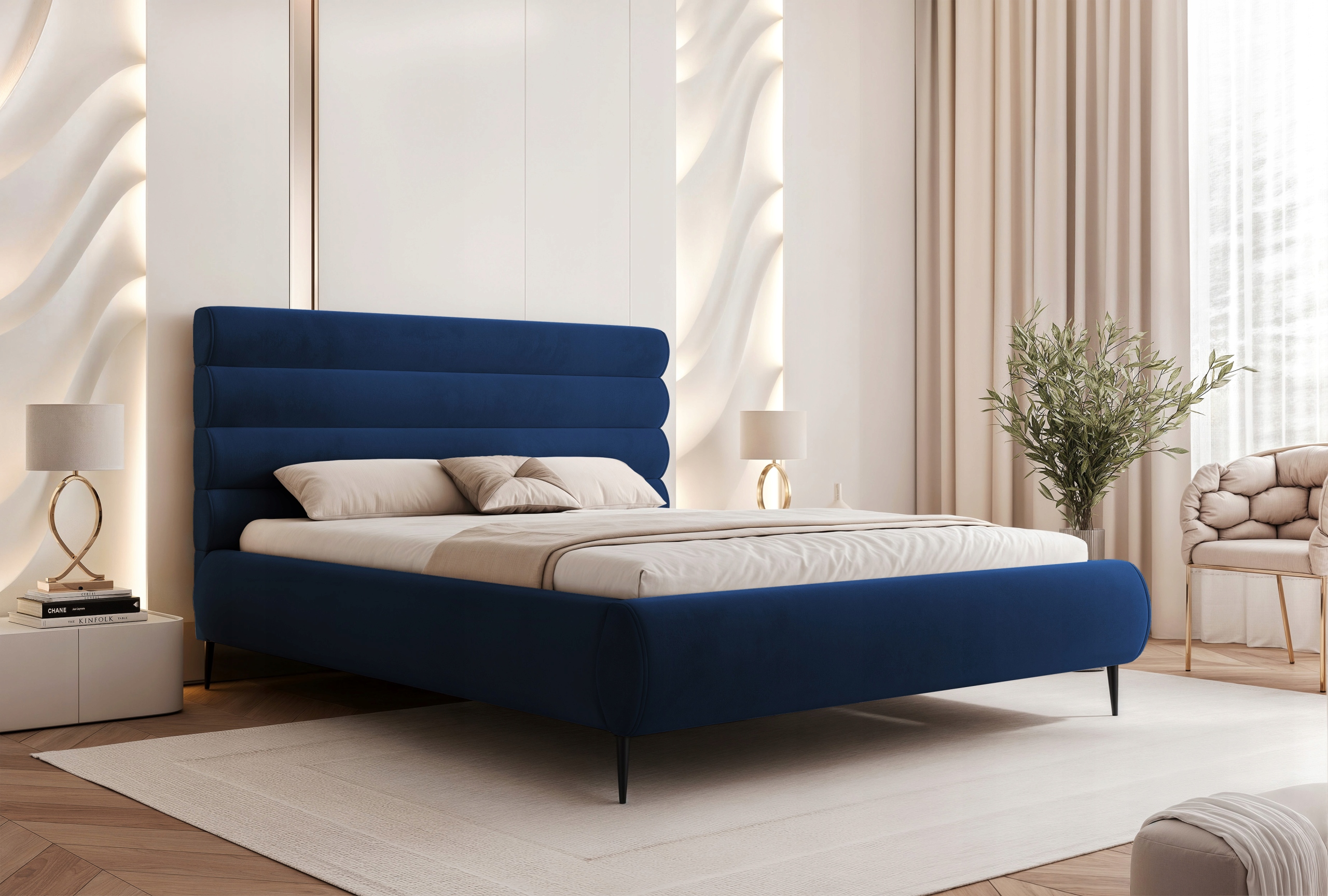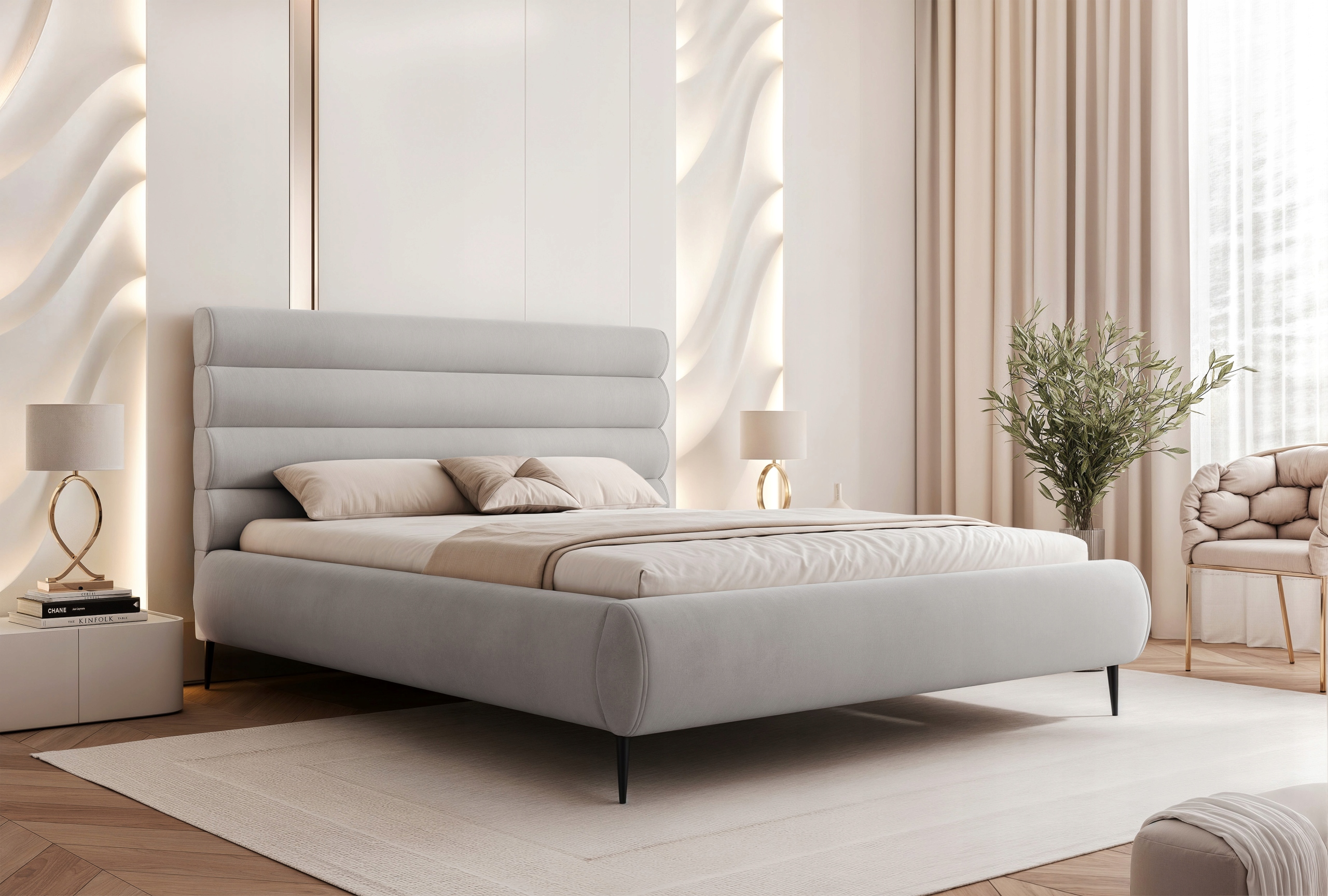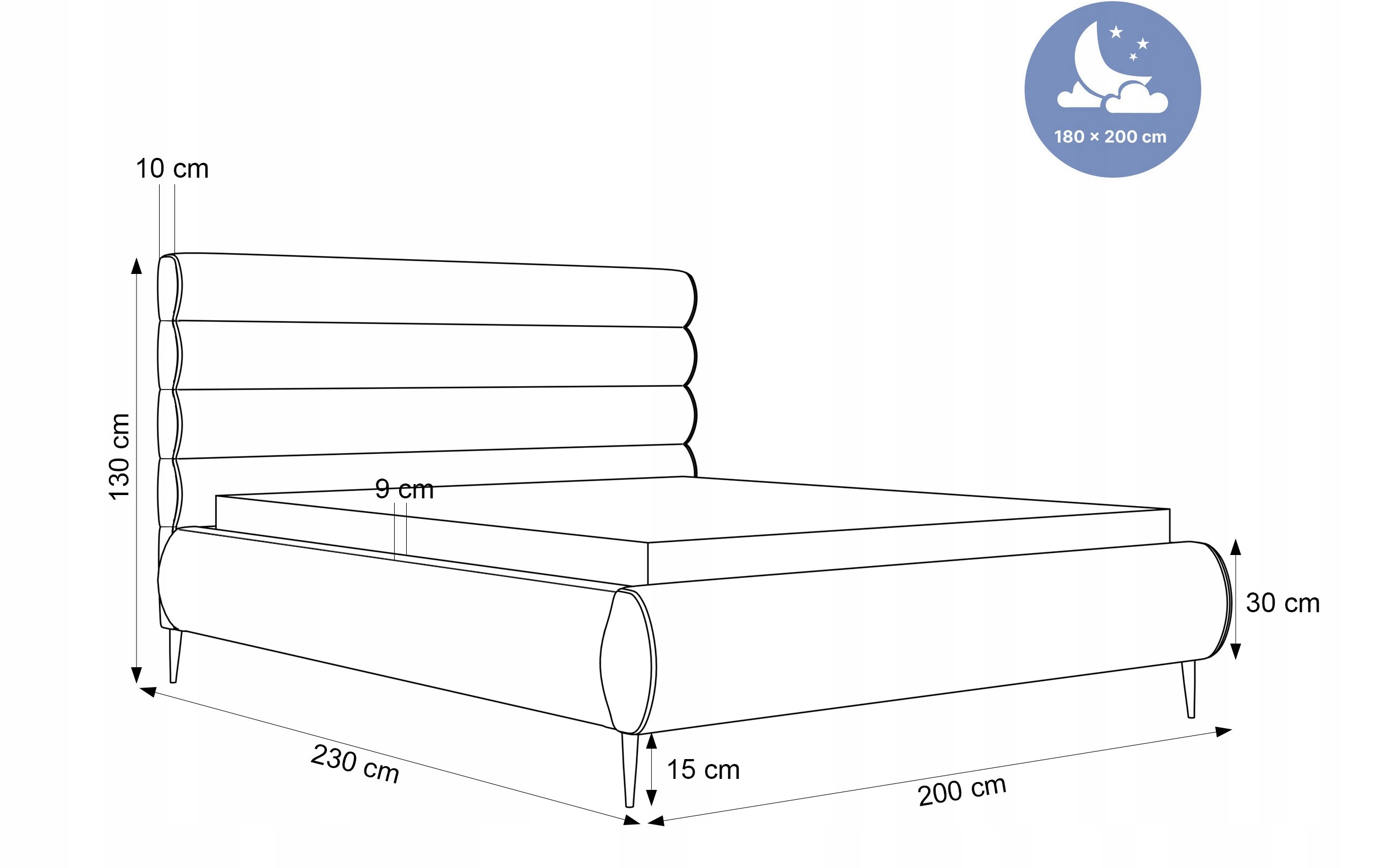 Łóżko sypialniane 180x200 Marbela II to idealny wybór dla osób ceniących nowoczesny design, komfort i wysoką jakość wykonania. Charakterystyczne poziome półwałki na wezgłowiu oraz obłe kształty nadają mu luksusowy wygląd, a smukłe wysokie metalowe nogi podkreślają jego lekkość i elegancję.