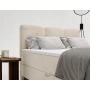 Główny materac opiera się na sprężynach bonellowych o wysokości 20 cm, co gwarantuje stabilne wsparcie i długotrwałą wytrzymałość. Zagłowię łóżka z grubej pianki posiada obłe kształty, które nadają stylowy i minimalistyczny wygląd.