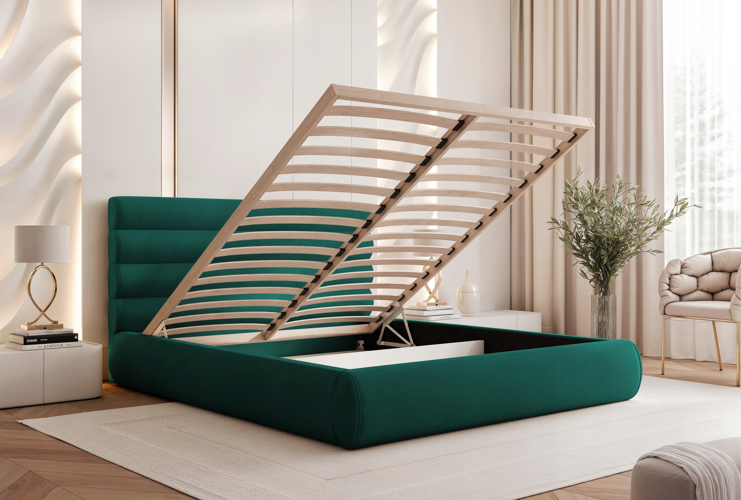 Łóżko tapicerowane 200x200 wyposażono w stelaż drewniany na sprężynach, zapewniający świetne podparcie materaca i wysoki komfort snu. Dodatkowym atutem jest praktyczny pojemnik na pościel, idealny do przechowywania kołder, poduszek i innych tekstyliów.